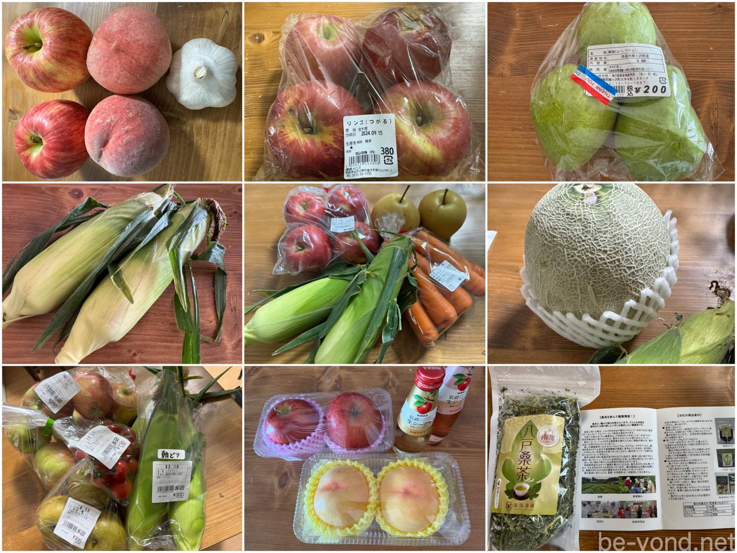 帰宅後、手に入れた新鮮な野菜や果物をテーブルに広げてみました。今回は初日に訪れた八戸の「館鼻岸壁朝市」をはじめ、金木町の「産直メロス」や「スーパーストア」、鯵ケ沢町の「海の駅わんど」、弘前市の「野市里」、平川市の「JA津軽産直センターひらか」など、3日間にわたり各地の直売所やスーパーに立ち寄りました。泊数が増えるほど日持ちを考えて選ぶ工夫は必要ですが、旬の味覚をたっぷり持ち帰ることができるのは、やはりロードトリップならではの楽しみです。
