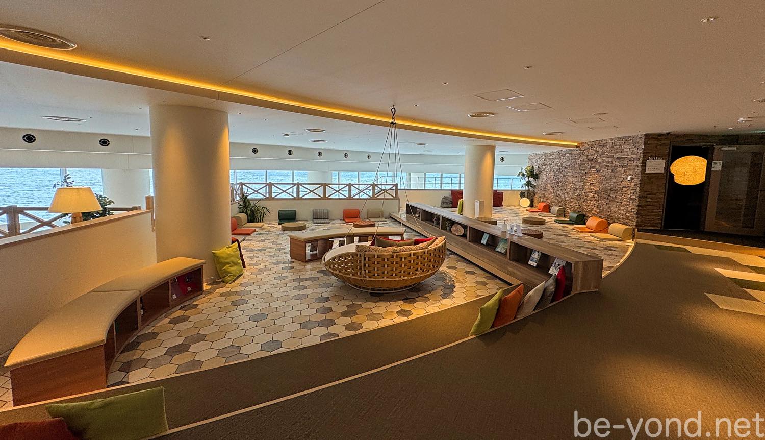 3階 開放的な「オーシャンラウンジ」と「ウミカゼテラス」