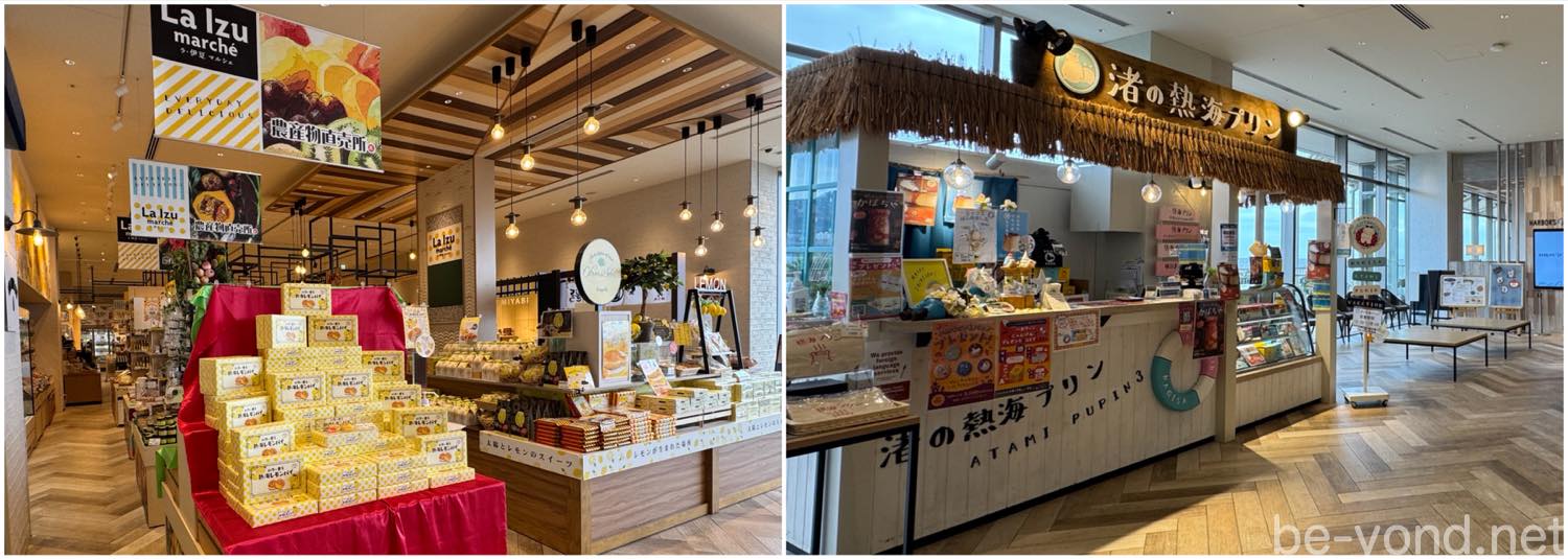 エレベーターでスパ受付フロントがある2階フロアへ。2階にはレストラン「HARBOR’S W」のほか、伊豆の特産品が並ぶ「La Izu marche」、熱海の人気スイーツ「熱海プリン」の店舗などもあり、オープンするまでの間はマルシェ内を見てまわりました。