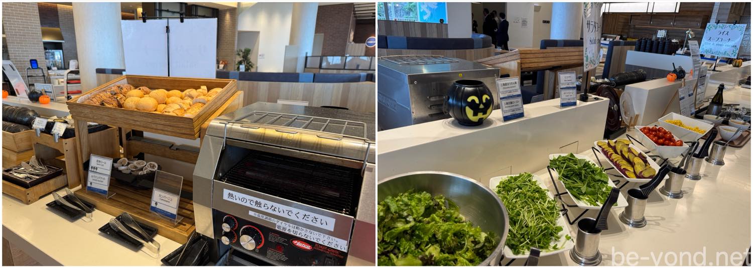 スパランチセットには、ライス、スープ、パン(3種)、ミニサラダバー(6種)が付きます。(ドリンクバーは別料金)