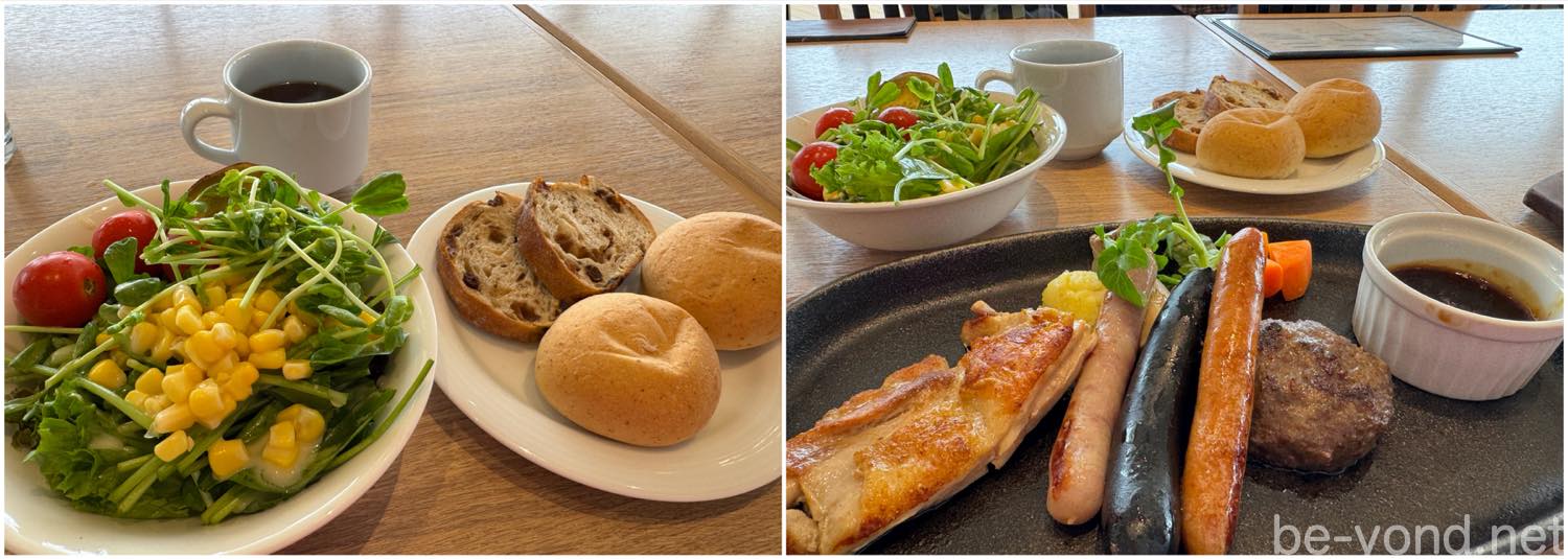 コンボプレート、スパゲッティ、ハンバーガー、ピザ、鶏のソテー、スズキの蒸し煮、牛ロースステーキなど、7種のメイン料理から選んだのは、3種のハコ豚ソーセージに、小ぶりのハンバーグと美味鶏のグリルが盛り合わせられた「静岡産コンボプレート」。パンにサラダやソーセージを挟んで、美味しくいただきました。