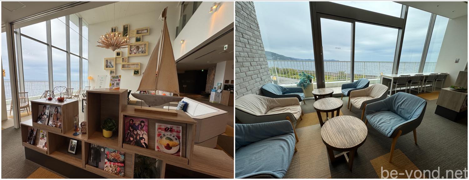 3階のエレベーターを降りると、目の前に広がるのは、さまざまなタイプの椅子やソファがゆったりと配置された、開放的なリラックス空間「セントラルラウンジ」。大きな窓から相模湾を一望でき、穏やかな波のきらめきを眺めながら、思い思いの時間を過ごせます。