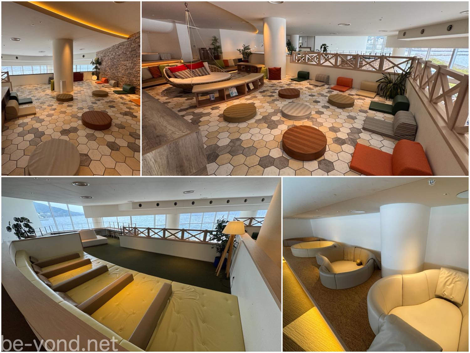 今回は2泊3日の旅の初日に、オーシャンスパ「Fuua」を初訪問。館内はどのエリアもおしゃれで快適です。コンセント付きのテーブル席やカウンター席も随所にあり、ワーケーションにもぴったり。Wi-Fi環境も安定しており、快適に作業ができました。