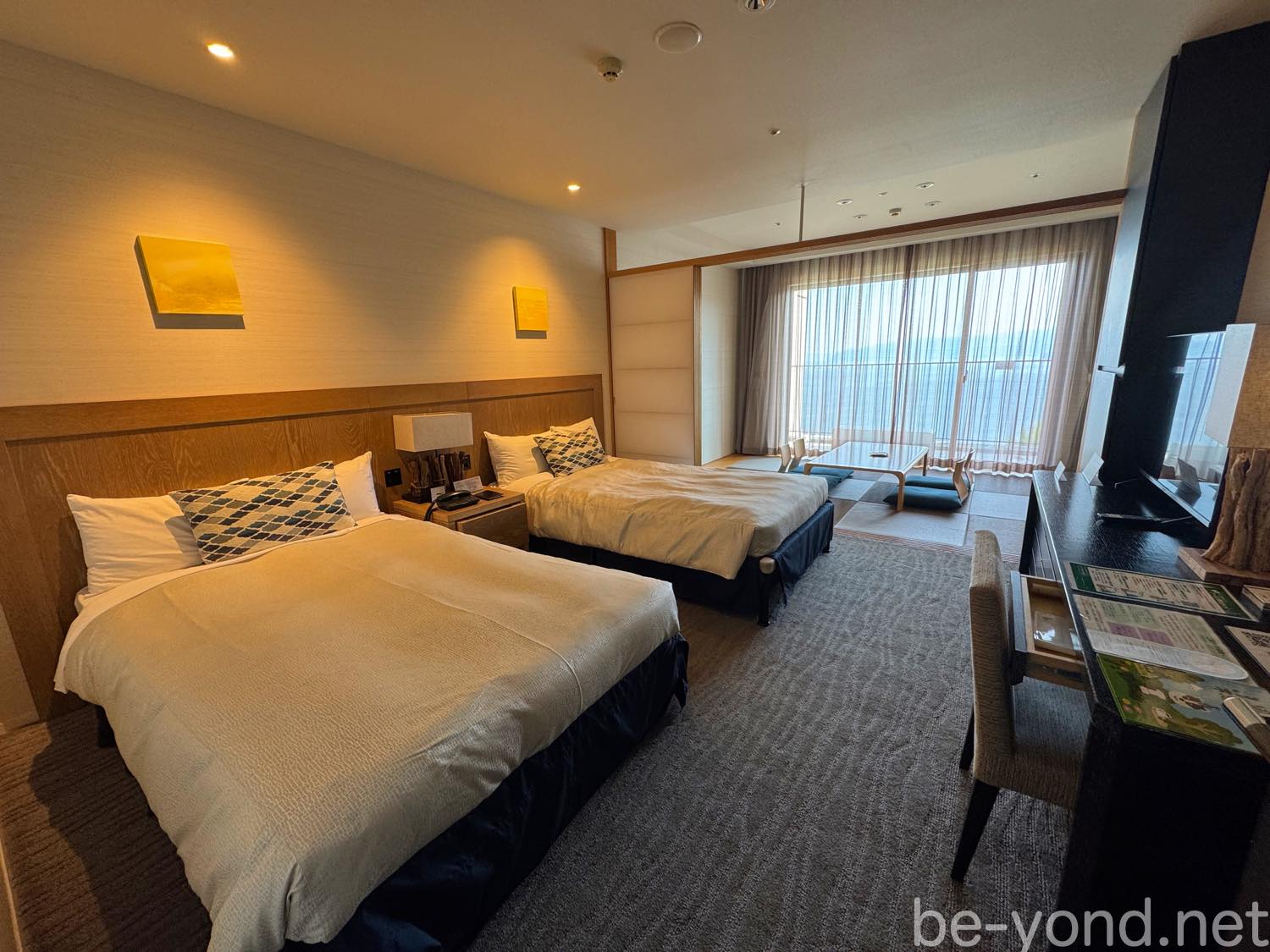 今回は法人契約によるサイトから朝食・夕食付きのプランを2名で予約したのですが、割り当てられたのはスタンダード和洋室(42〜48㎡)でした。このタイプの和洋室では、洋室のセミダブルベッド×2、和室の布団×3の計5名までステイできるようです。