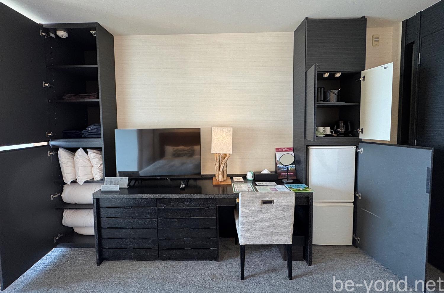 右手の棚には、アイスペール・ピッチャー・電気ポット、グラス、カップ、冷蔵庫(冷凍庫付)、左手の棚には館内着や枕などのリネン用品が用意されています。