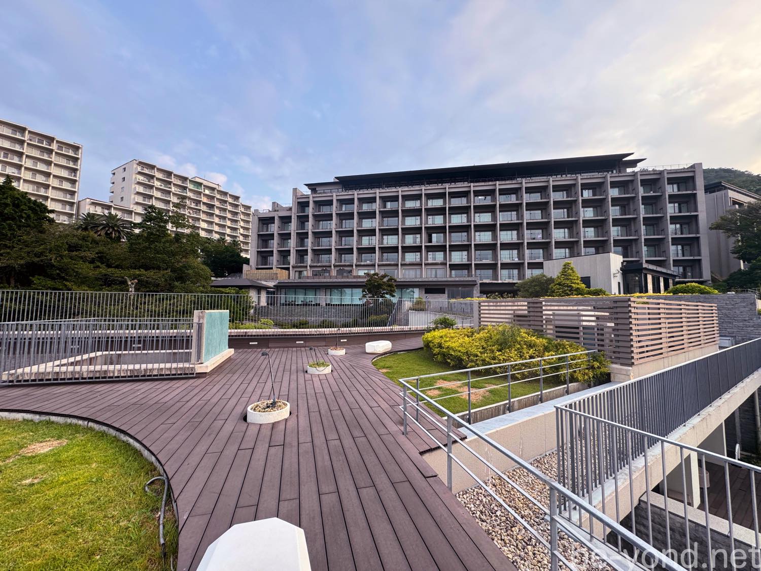 屋外プールに隣接する庭園から本館に向けての景色。トップの屋根の下が7階ロビーフロアです。