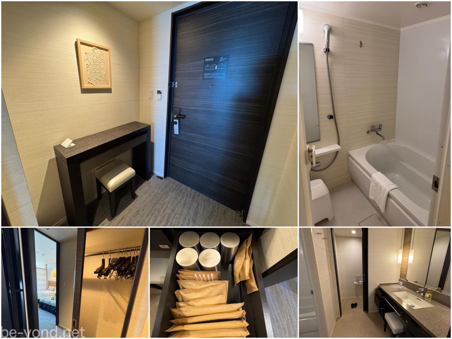 ルームキーはカード式で入口に備え付けの差込口に入れることで電気がつくタイプ。洗面所、バスルーム、トイレは別で、玄関前には鏡付きのクロークがあります。アメニティは、シャンプー、リンス、ボディソープ、綿棒、ヘアキャップ、歯ブラシ、カミソリ、ドライヤー、タオル類と標準的、化粧水や乳液、メイク落としといった基礎化粧品はありませんが、大浴場に用意されています。