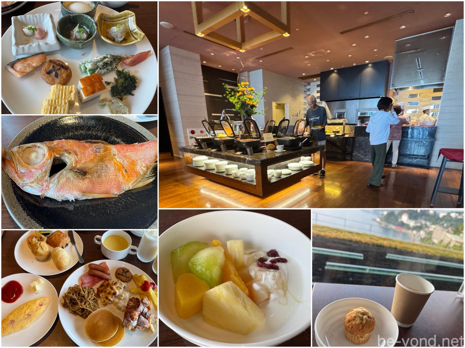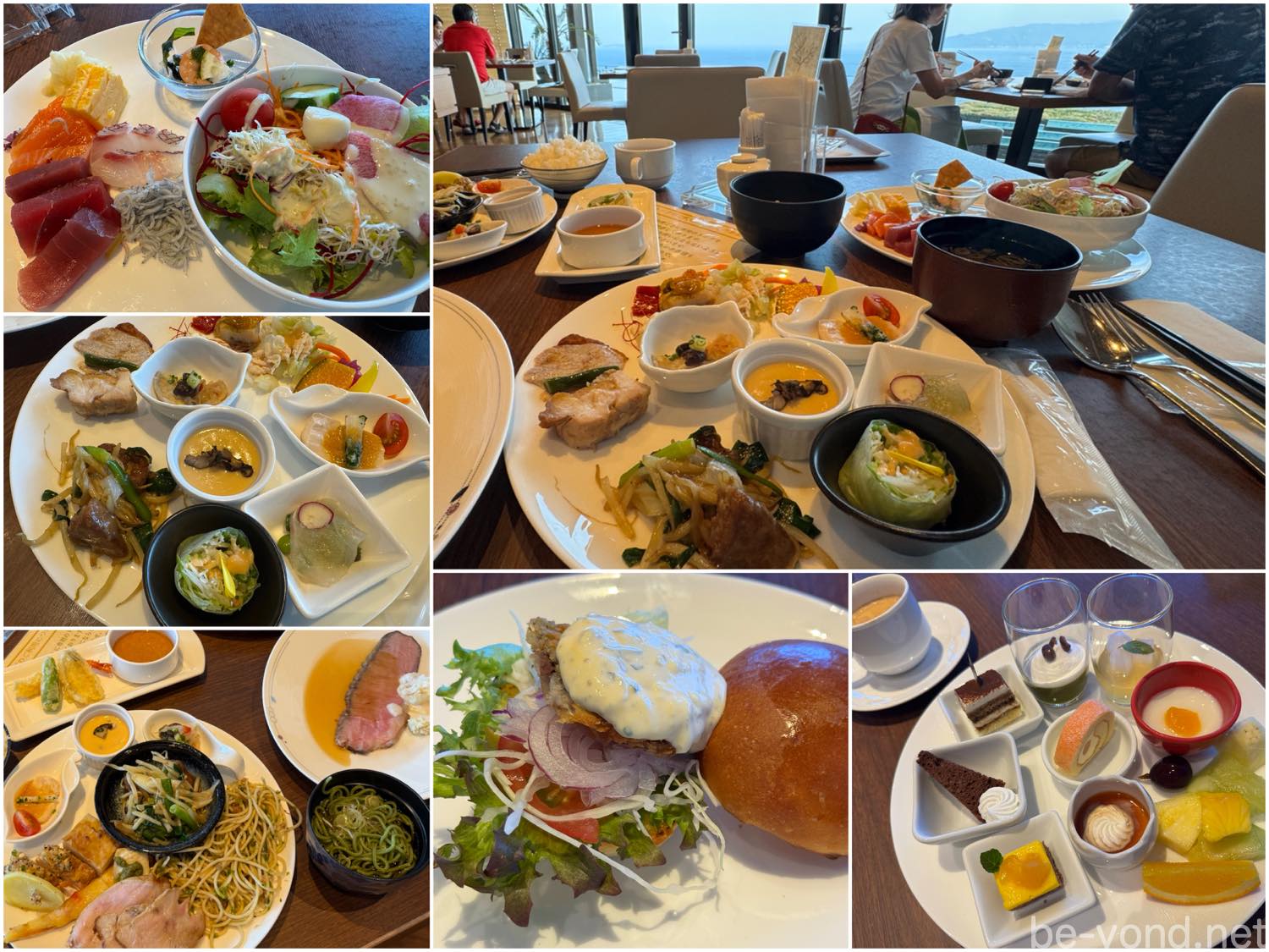 ライブキッチンではローストビーフや熱海バーガー(アジフライ入り)など出来立てが提供され、さらにデザートコーナーにはケーキやプリン、ゼリー、フレッシュフルーツも多彩に並び、品数・味とともに充実した内容でした。
