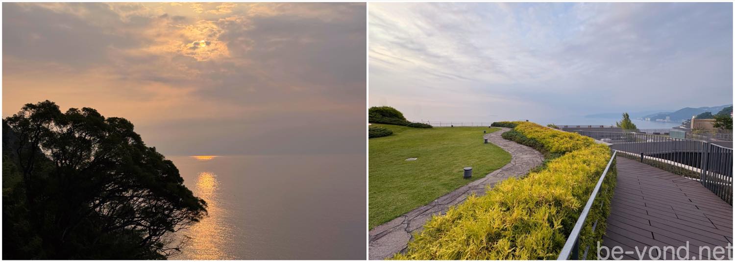 早朝の大浴場から眺めた朝焼けがあまりにきれいだったので、湯上がりにそのまま庭園へ。澄んだ空気に包まれ、爽やかな潮風を感じながら鳥のさえずりに耳を傾ける…そんな気持ちの良い朝のひとときでした。