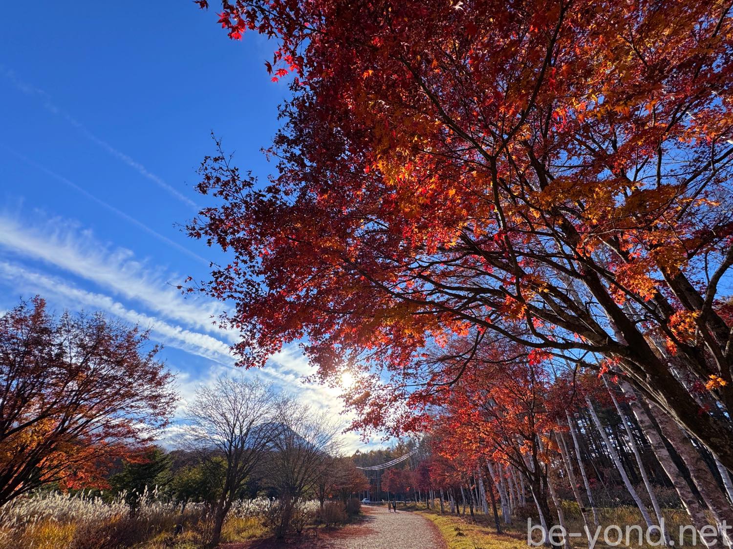 すでに落ち葉となったもみじが散策路を鮮やかな色に染めています。青空に浮かぶ一筋の長い雲が龍みたい。