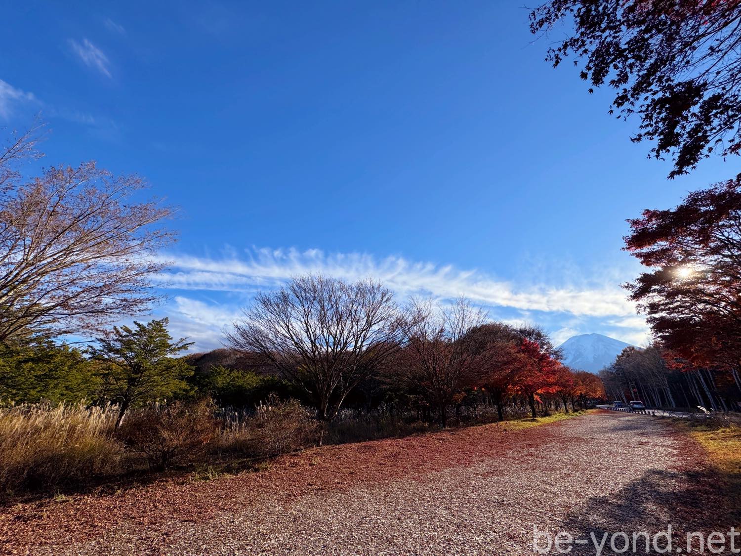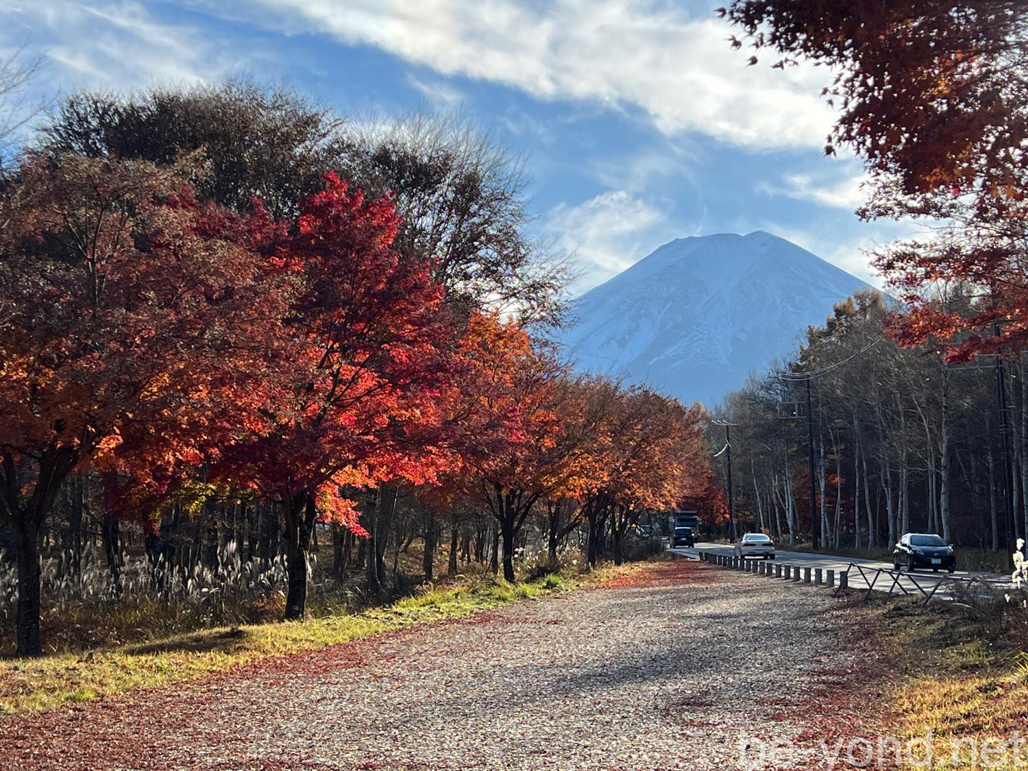 紅葉Lineは、富士吉田忍野インターを出てすぐ。富士散策公園に無料駐車場があります。紅葉シーズンは路駐祭りになるようですが、訪問した勤労感謝の祝日は、ほとんど訪問者がおらず公園に向かう途中の駐車スペースに余裕でパーキングできました。