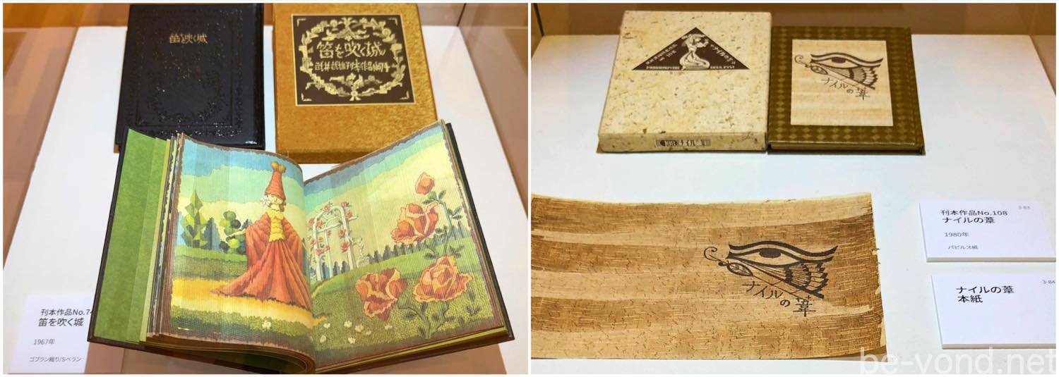 また、麦わら細工やゴブラン織り、古代エジプトで使われていた紙の祖パピルス(栽培から手掛け完成までに4年半の歳月をかけた)を使用するなど、表紙や本文に様々な拘りの素材と技巧を駆使した刊本作品には圧倒です!