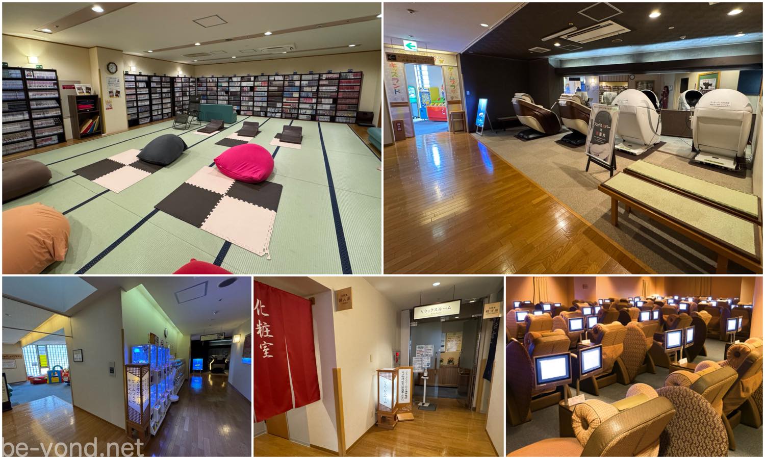 同じフロアには、約1万冊が並ぶマンガコーナーや、ゲーム&キッズコーナー、さらにコインマッサージ、インターネットコーナー、宴会場などの設備もあり、思い思いの時間を過ごせる、多彩なリフレッシュ空間となっています。