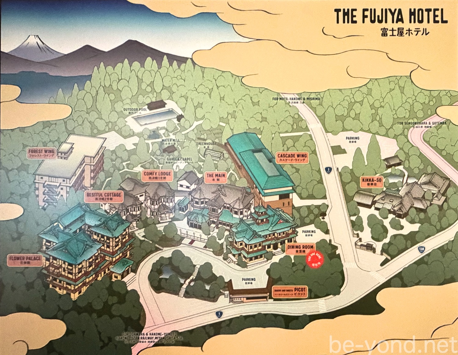 こちらは館内にある懐かしい色調の富士屋ホテル案内図。ホテルの全景を鳥瞰図で描かれており、本館を中心に、花御殿、西洋館、食堂棟、フォレストウィング、カスケードウィングなど、歴史的な建築群が山の斜面に沿って配置されている様子がよくわかります。