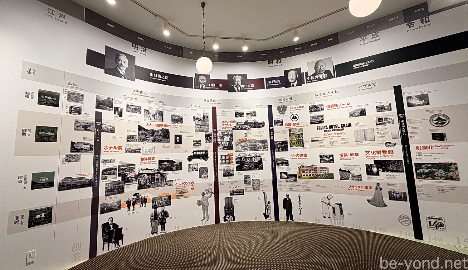 1878年、日本初の本格的リゾートホテルとして箱根・宮ノ下で開業した富士屋ホテル。ギャラリーの壁面を埋め尽くす湾曲した巨大年表「軌跡」は、江戸末期の創業前から令和の現在に至るまで、140年余にわたる壮大な歴史を、豊富な写真とともに一望できる圧巻の展示です。