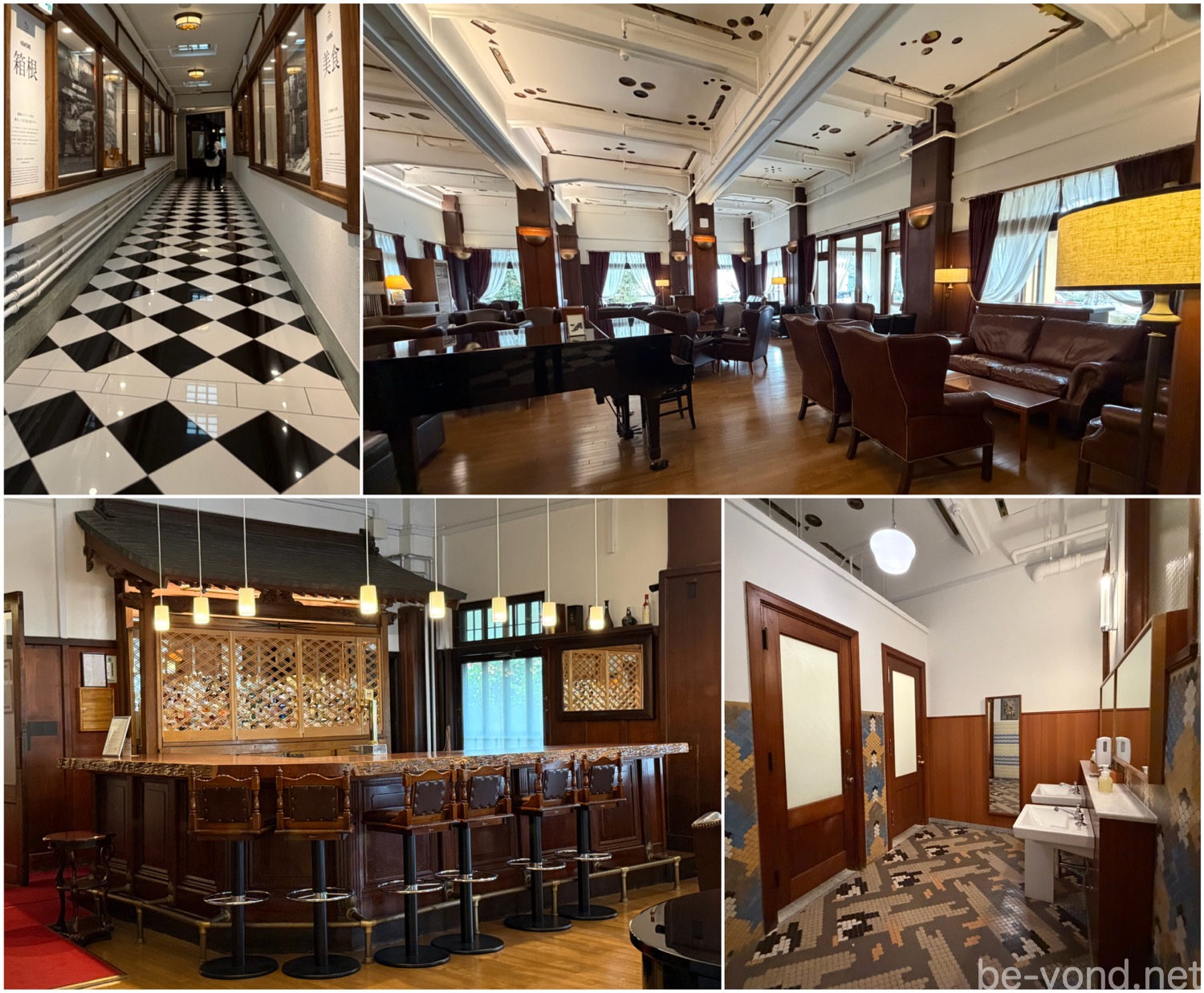 食堂棟の地下1階には、ホテルショップやバー、バンケットホールのほか、大人の隠れ家のような「バー・ヴィクトリア」(17時から営業)があります。神社の社殿を思わせる屋根が設えられたバーカウンターは、まさに富士屋ホテルらしい和洋折衷の極み。隣接するレストルームもまた、往時の趣を伝える美しいタイル装飾が足元を彩り、細部まで格式の高さを感じさせます。