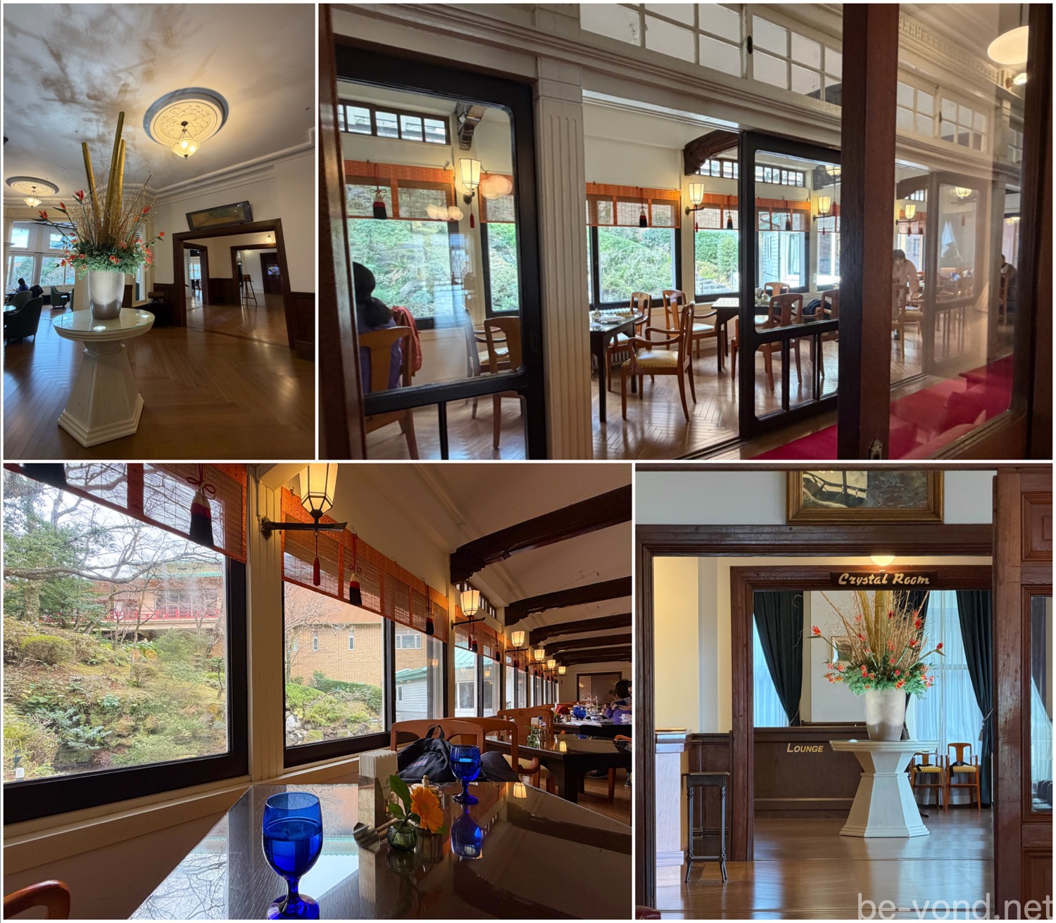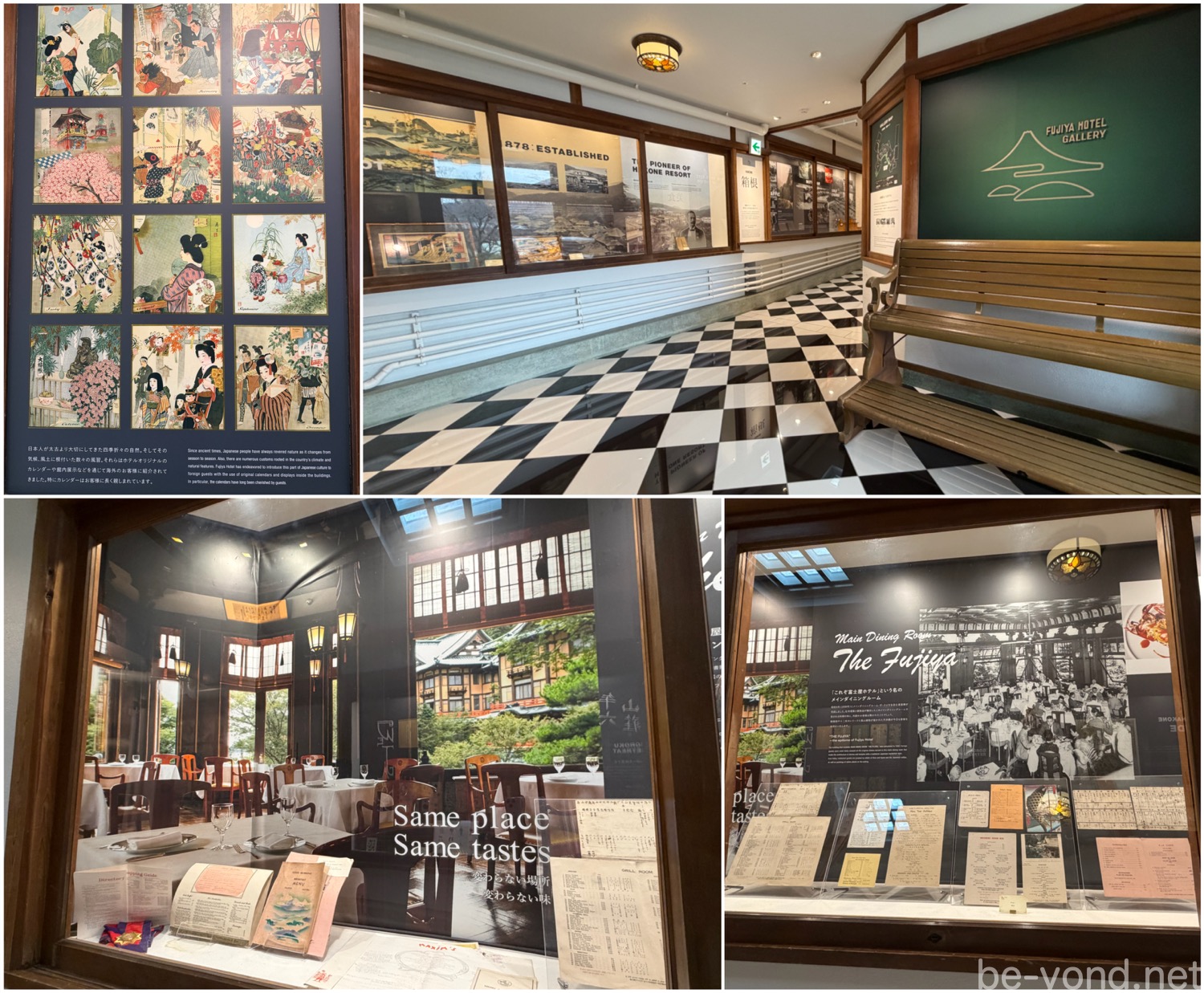 レトロな市松模様の床が続く廊下には、色鮮やかな浮世絵のカレンダーやメインダイニングの記録など、魅力的な資料が展示されていました。この場所が紡いできた140年余の物語に思いを馳せます…。