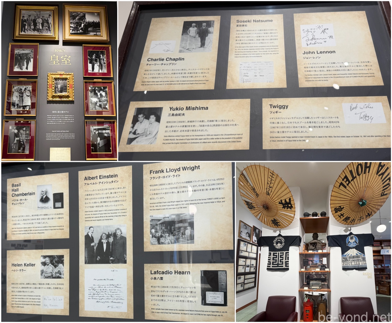 皇室をはじめ、アインシュタインやヘレン・ケラー、チャップリン、ジョン・レノンといった世界の偉人たちが遺したサインやエピソードは必見です。夏目漱石のサインや、三島由紀夫が執筆に用いた便箋など、貴重な展示が数多く並びます。また、当時使用されていた法被や和傘の展示からは、日本独自の文化で海外の賓客をもてなしてきた、誇り高い伝統が感じられます。