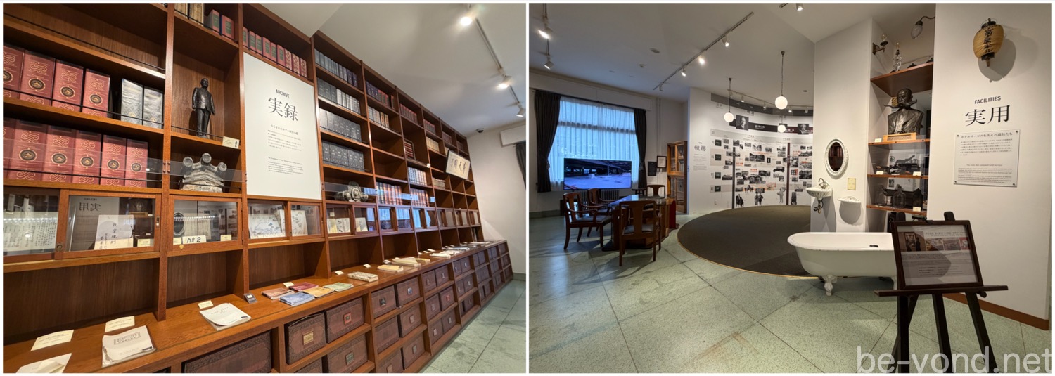 2020年7月のリニューアルに伴い、花御殿の地下(かつての屋内プール跡)に誕生した「ホテル・ミュージアム」。ホテルの膨大なアーカイブを一般公開するこの貴重な場所には、和洋折衷の建築美を裏側で支えてきた経営資料の「実録」や、実際に客室で使用されていた猫脚のバスタブや洗面台など当時のホテルライフを彩った「実用品」などが整然と並び、ホテルそのものが一つの美術館であるかのような、深い歴史を視覚的に体感できる構成になっています。