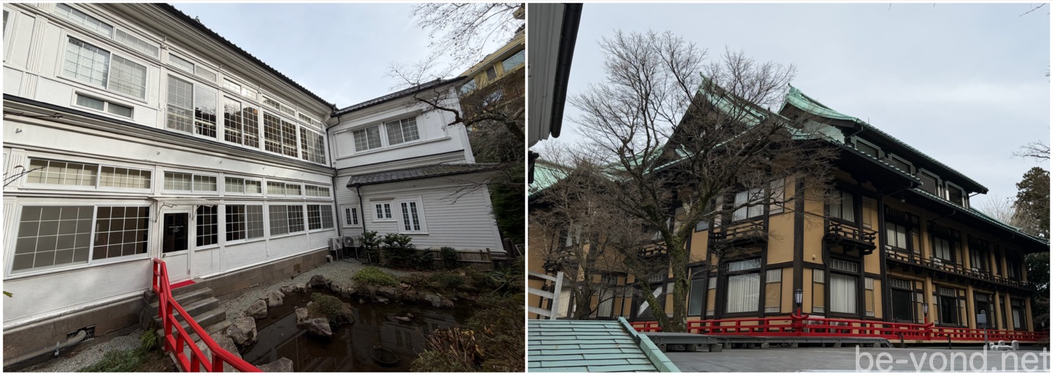 ラウンジ前の池から時計回りで庭園散策をスタート☆ 白い下見板張りに格子状の窓が続く西洋館は、小さな池にかかる赤い手摺が印象的。続いて一見お寺のような重厚な屋根を持つ花御殿は、裏側から見てもその圧倒的な建築美に目を奪われます。