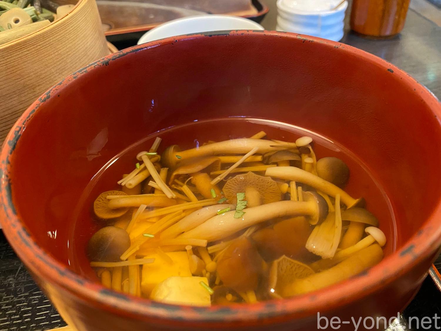 釜めしと同様に香の物、茶碗蒸し、吸い物がセットになっています。吸い物は+200円できのこ汁(とろろ汁もあり)に変更してみました。