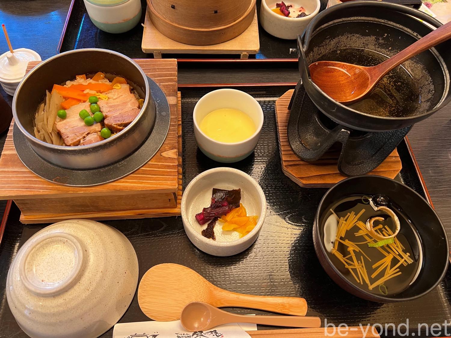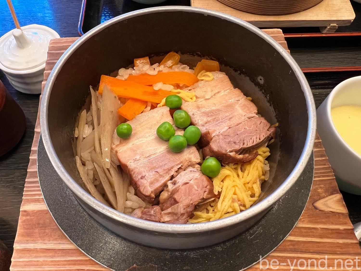 こちらは、一番人気という「箱根山麓豚の角煮釜めし」。角煮に錦糸たまご、ごぼう、にんじん、グリーンピースが入っています。香の物、銀杏入りのミニ茶碗蒸し、吸い物がついてきました。