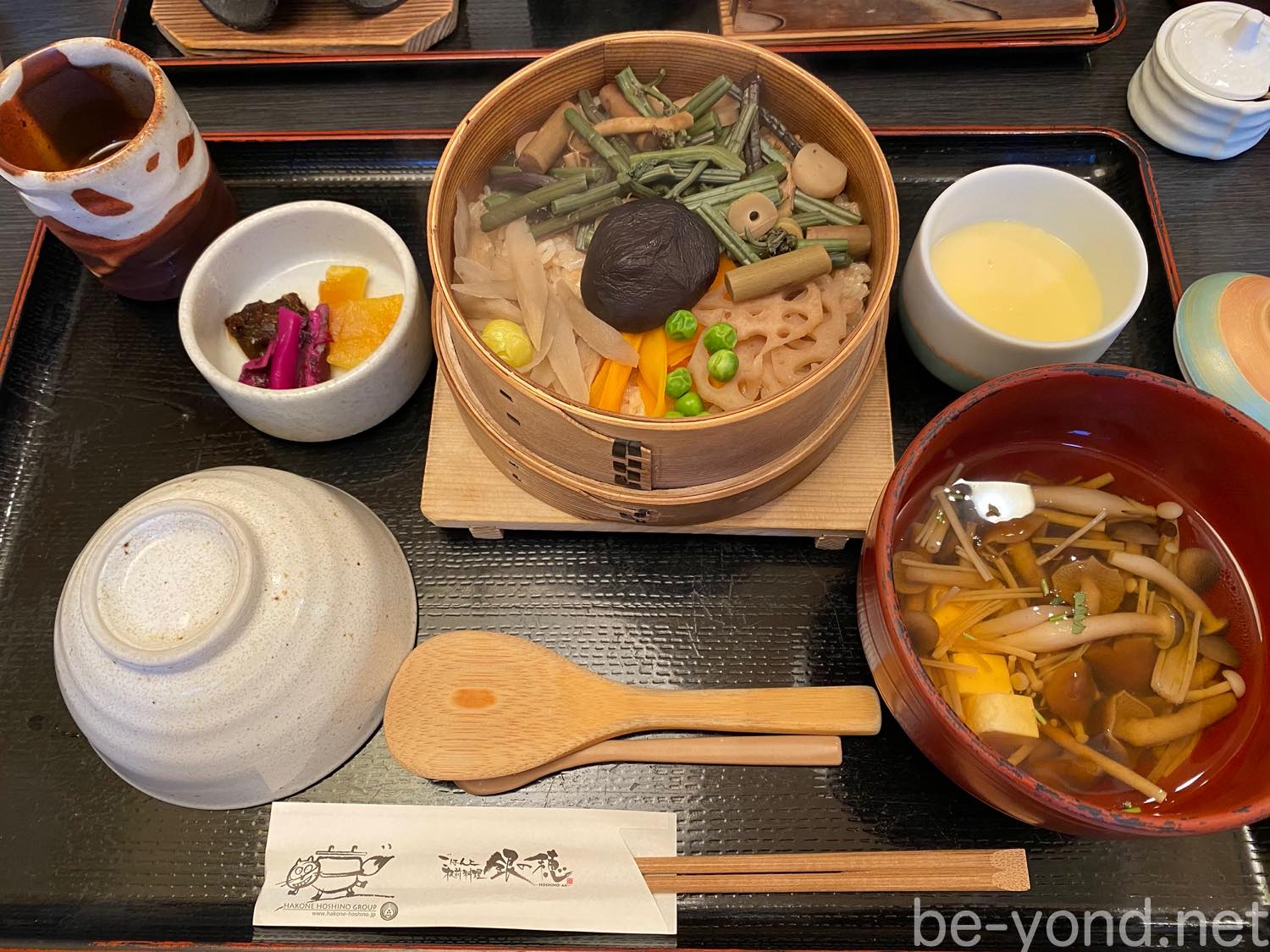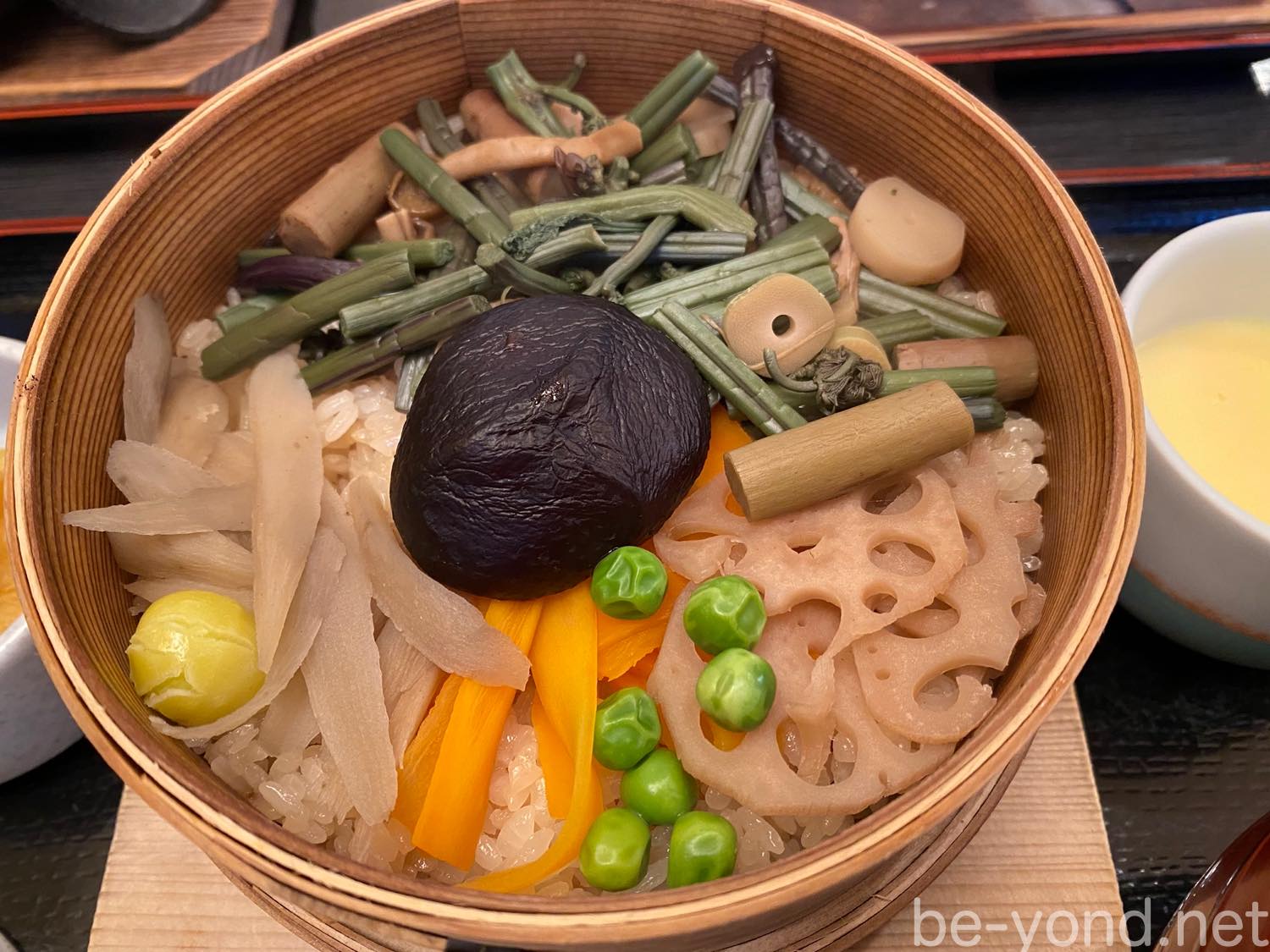 こちらは、椎茸・山菜・人参・ごぼう・にんじん・蓮根がのった「山菜わっぱめし」(わっぱ飯は、杉の薄い板を曲げて作った器に薄い塩味のだしを加えて炊いたご飯と旬の具材をのせて蒸したもの)。