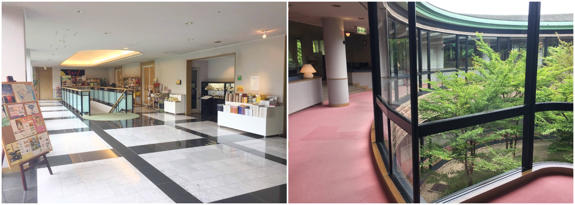 山に囲まれた起伏の激しい土地柄のせいか玄関とフロントは2階。フロントの前が売店(購入時10%割引)、裏に位置する場所にラウンジ、レストランと続きます。