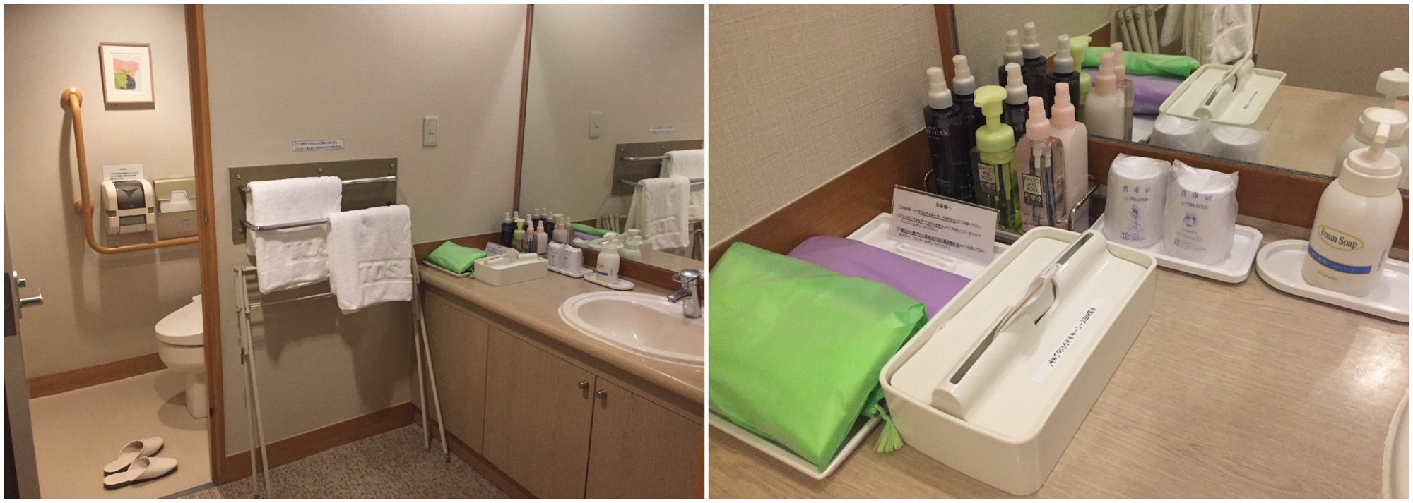 客室の扉をあけると広めなスペースにクローゼット(浴衣あり)、トイレ、洗面所があり、アメニティもバッチリ揃ってます。