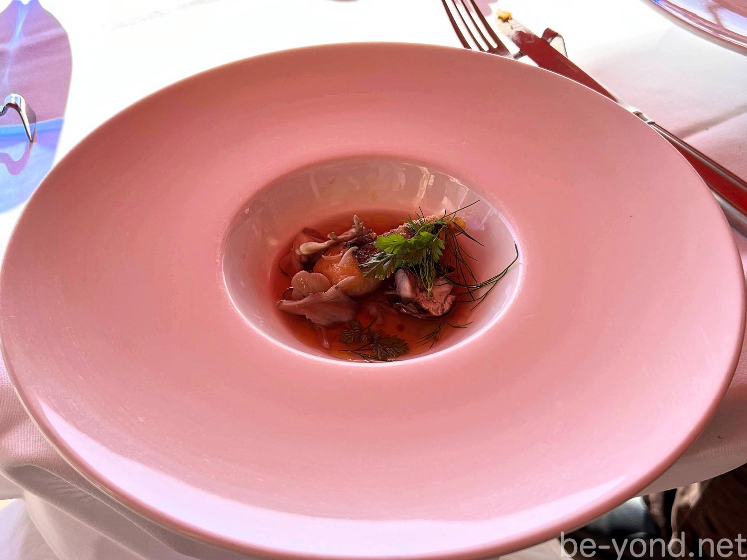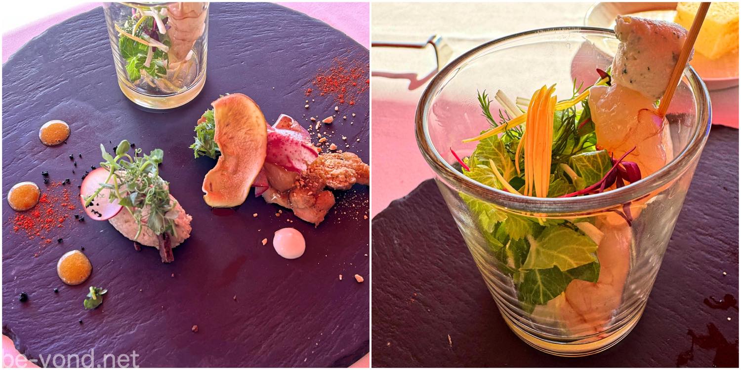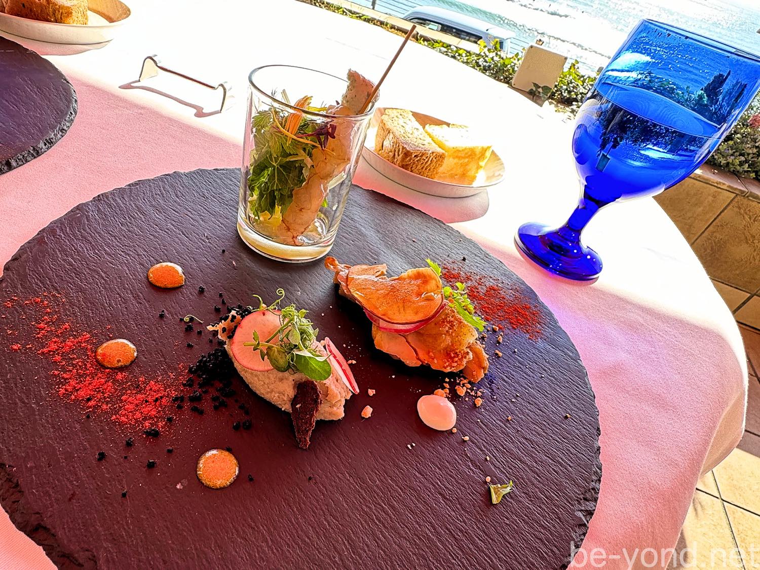 給仕人がひと通り料理の説明をしてくれますが、グラスの中のマリネはどうやって食べるのがいいだろうと思っていたら…最後に「赤えびの串を外して添えられたリコッタチーズと一緒にグラスの中でかき混ぜていただいてください。」という口添えが。丁寧かつ完璧な説明です☺︎