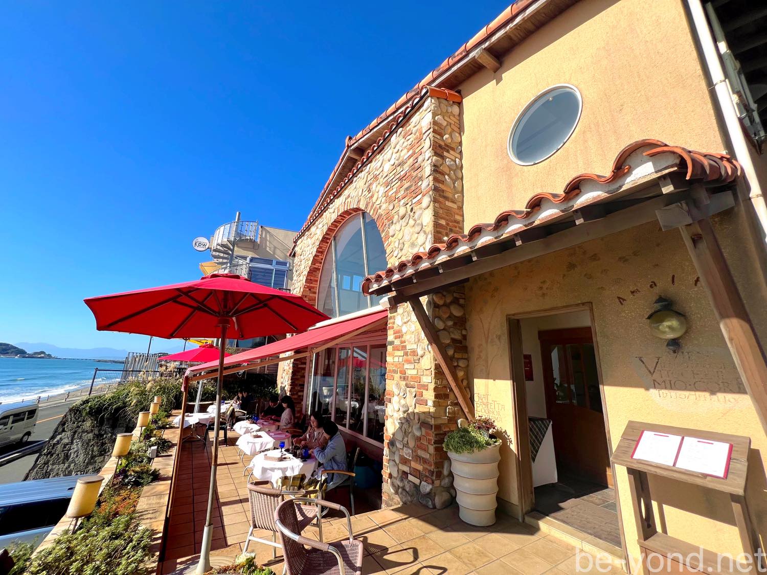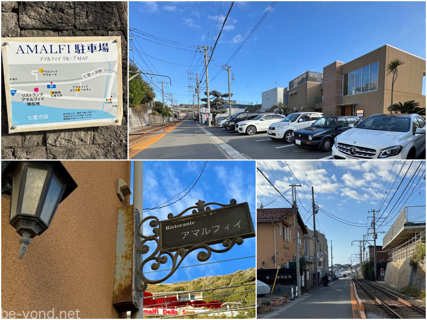 都内から高速を使い約1時間半ほどで現地に到着!アマルフィイグループ(4店舗共通)の駐車場を利用しました。店前にも駐車スペース(軽自動車を含む4台)はあるのですが、車通りの多い国道134号線より1本入った通りの方がスムーズに駐車ができ、アマルフィイ本店までも裏道からすぐ。タイミングが良いと目の前を江ノ電が通過していくノスタルジックな光景が見られます。