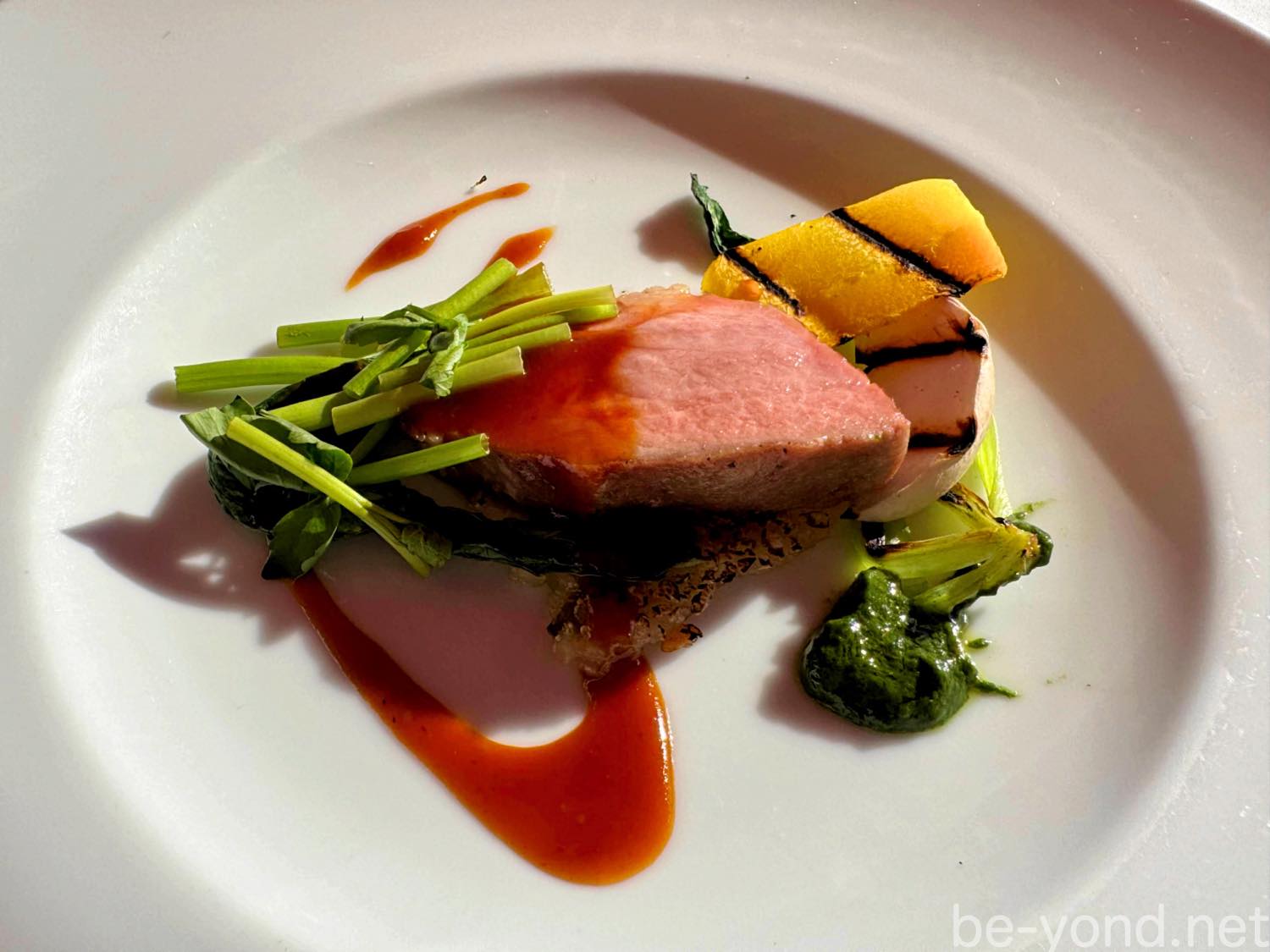 - 鳥取県産大山鶏もも肉のスモークとりんごのロースト ゴボウと柑橘スパイスのデュカ