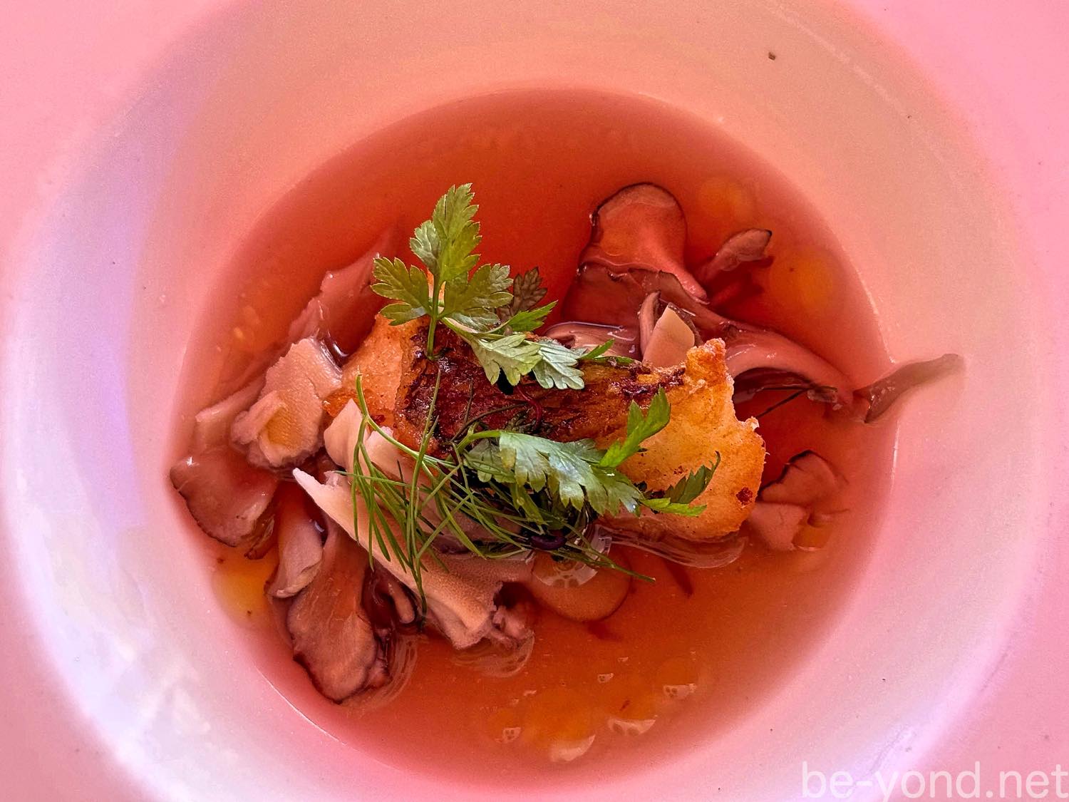 魚料理はアマルフィイコースと同じ「相模湾で獲れた本日の鮮魚のセモリナ粉フリット」。たっぷりと入った舞茸のスープに皮ごとパリッと揚げられた真鯛が浮かんでいます。上にのった香草がさらに良い風味を出している感じ🌿