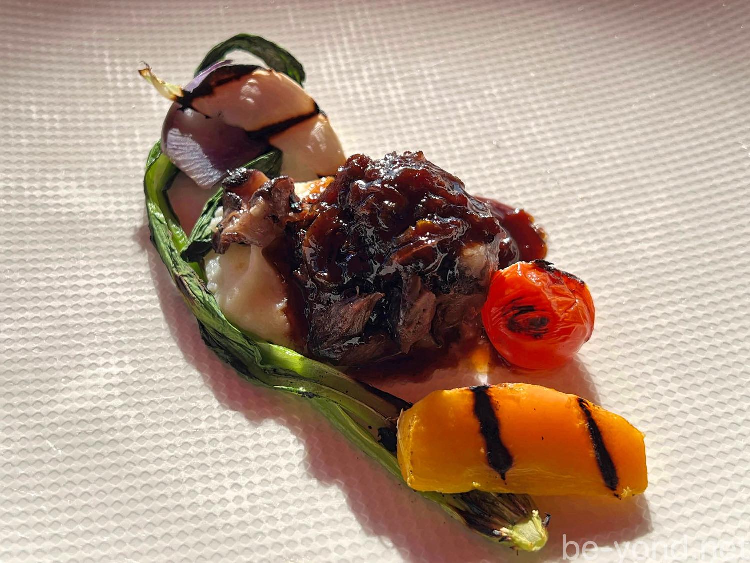肉料理は「相模牛すね肉のペポーゾ」。黒胡椒と赤ワインを一緒に長時間煮込んだトスカーナの伝統料理ですね。トロトロになったペポーゾに、きたあかりのピュレと鎌倉野菜が添えられています。