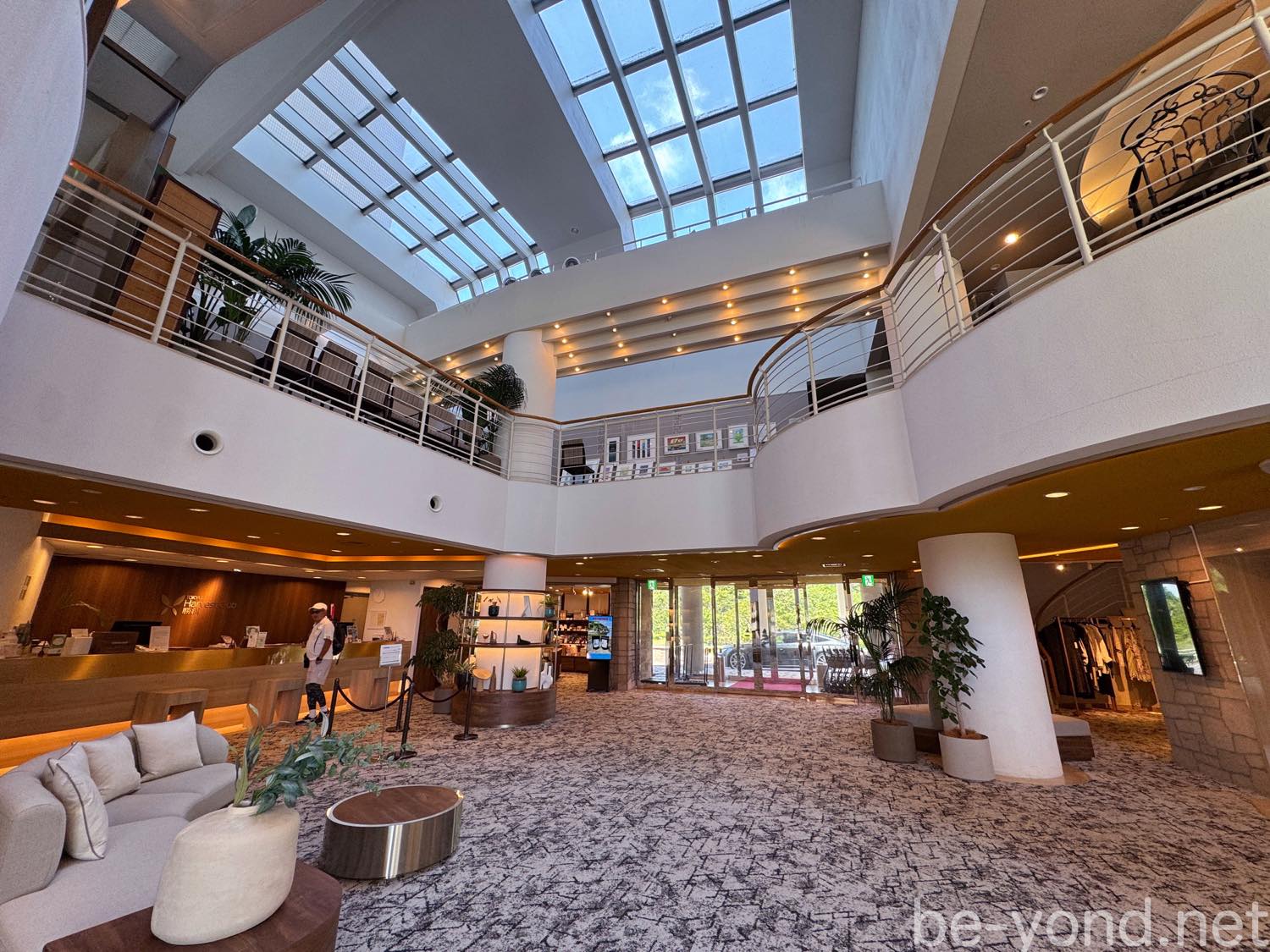 客室の用意ができるまでの間はこちらのラウンジでPC作業。ホテル全館で無料Wi-Fiが利用でき、通信速度は動画視聴やオンライン会議に十分対応できるレベルで、実用性は高めです。青い空と緑の景観を眺めながらの心地よい環境でした。