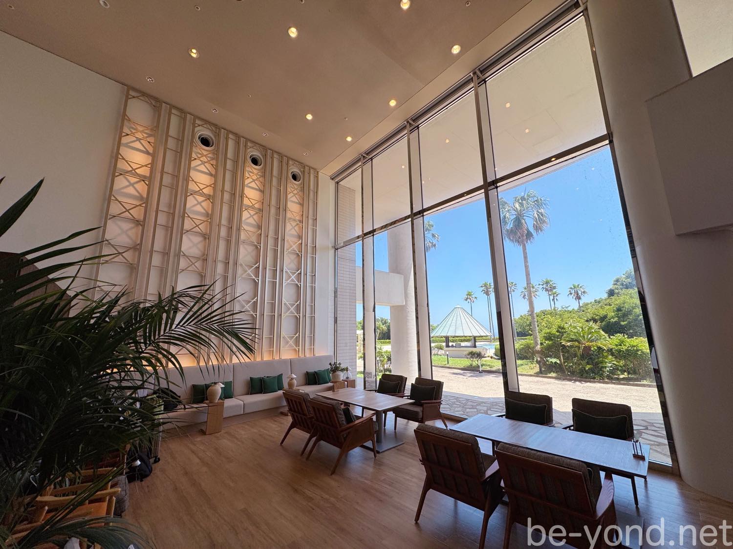 天井までガラス張りのラウンジは明るくスタイリッシュなデザインで、窓の向こうにはプールサイドのパームツリーが並びリゾート感たっぷり、南国に訪れたような気分になります。