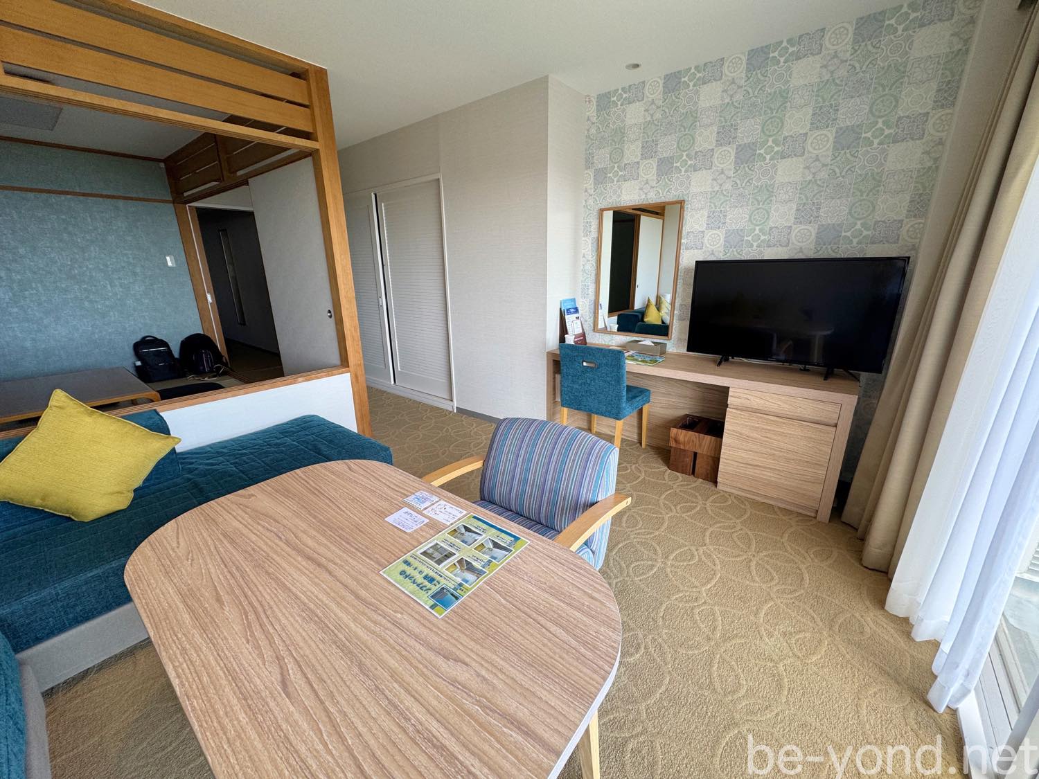 メインルームの中央には楕円形の大テーブル。仕事で使用する際は窓際に移動し、大海原を目前にリラックスしながら快適に集中することができました。ベランダ側に洋室があるタイプの客室で良かったです。