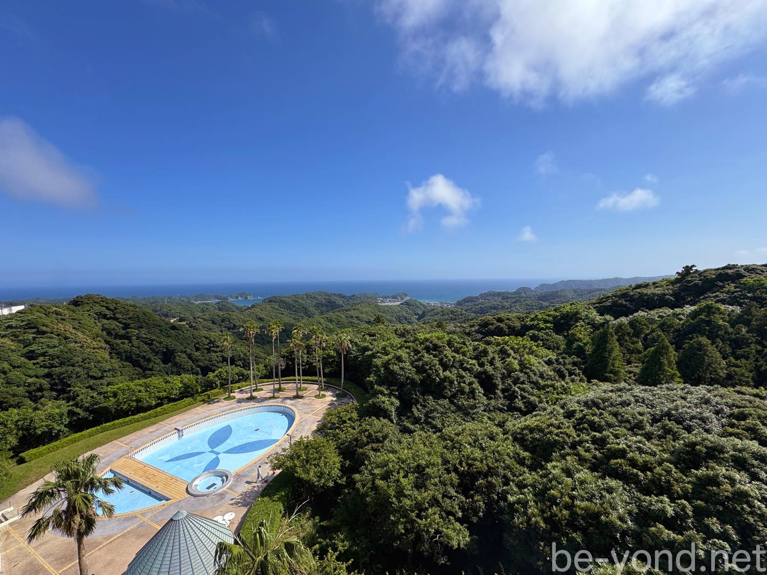 眼下には緑に囲まれたプール(夏季のみ営業)とパームツリー、その先には太平洋の大海原と空がどこまでも続く、爽快な景色が広がっています。