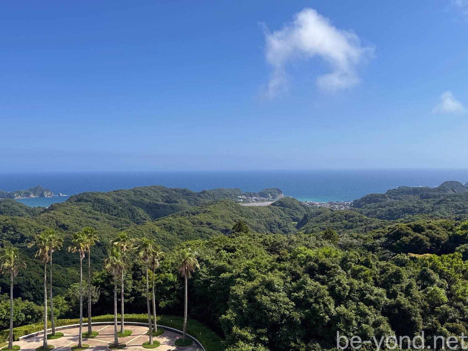 山々の深い緑から、エメラルドグリーン、そして紺碧へと移ろう太平洋のグラデーションが美しい✨️ その左手には鵜原湾と明神岬、右手には守谷海岸と大ケ岬が望めます。