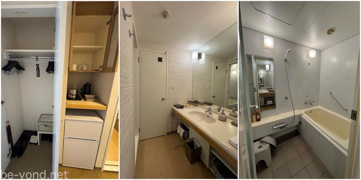 洗面所、バスルーム、トイレは別。クローク(セーフティボックスあり)横の棚に小サイズの冷凍冷蔵庫やケトル・カップなどがセットされ、アメニティは標準的で、化粧水や乳液、メイク落としといった基礎化粧品は大浴場に用意されています。