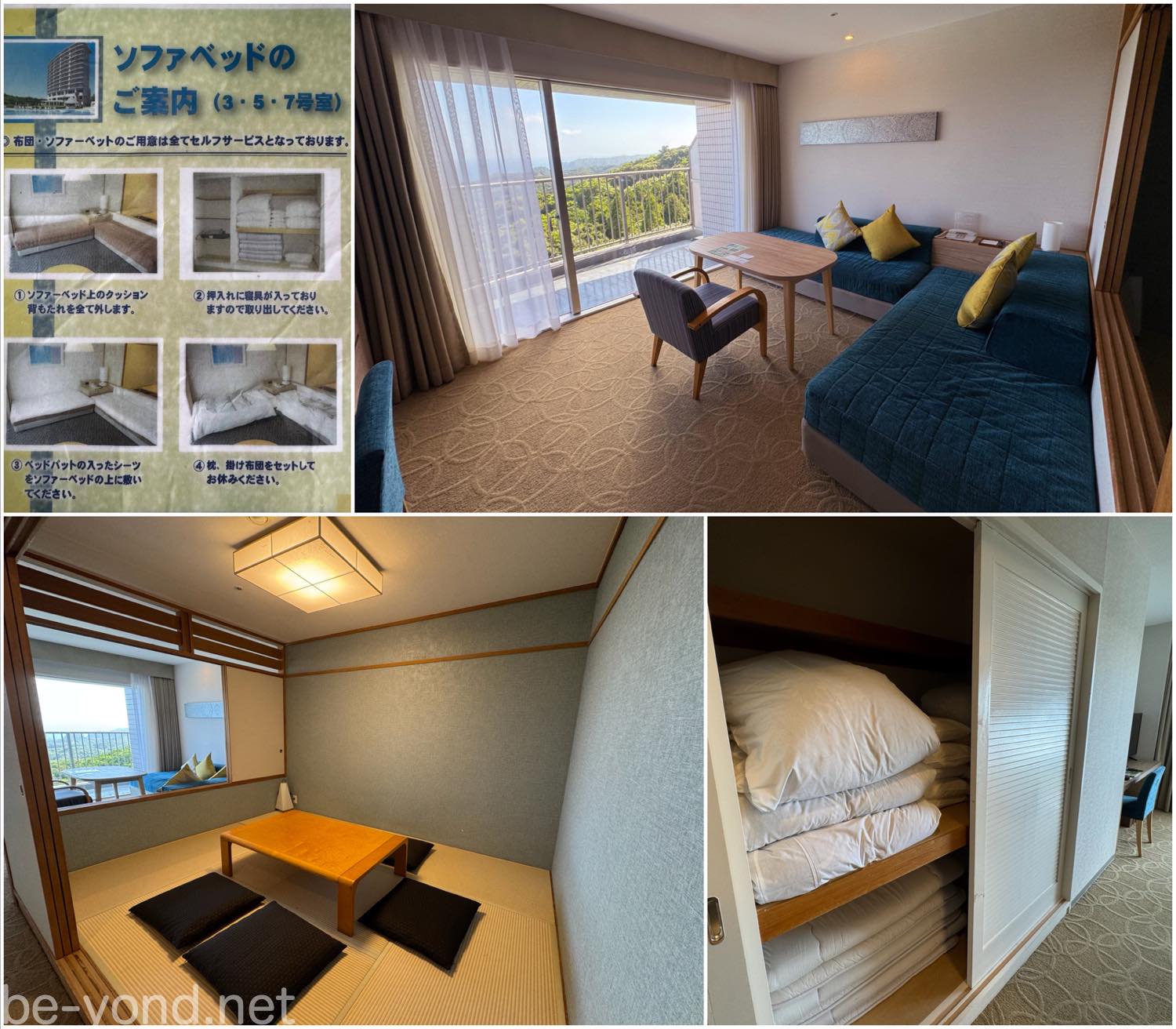 実はチェックインの際、ソファベッド仕様の客室と案内されたのでツインの洋室を希望したのですが、1泊目に空きがなく結局和洋室に。布団が嫌なので普段は和室タイプを避けているのですが、洋室または和洋室と案内されていたので安心していたら…こんなこともあるのですね。