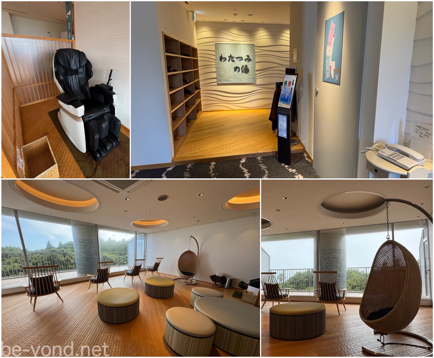 3階にある大浴場「わたつみの湯」は、サウナや水風呂を備えた湯処(営業時間は6:00〜10:00 / 日曜・特定期間は5:00〜、15:00〜24:00 / 土曜・特定期間は〜1:00)。入浴後は隣接するラウンジで、マッサージチェアに身をゆだねたり、木製チェアやハンギングチェアに腰掛けて、窓の外に広がる景色を眺めながらゆっくり過ごせます。