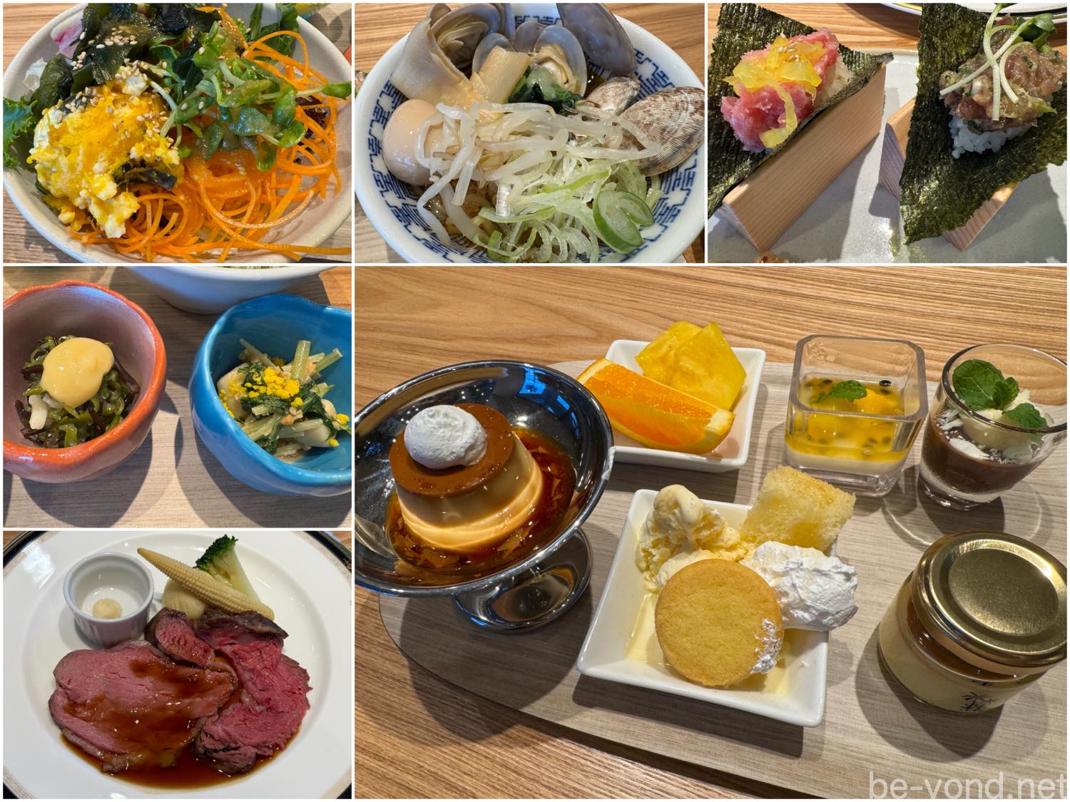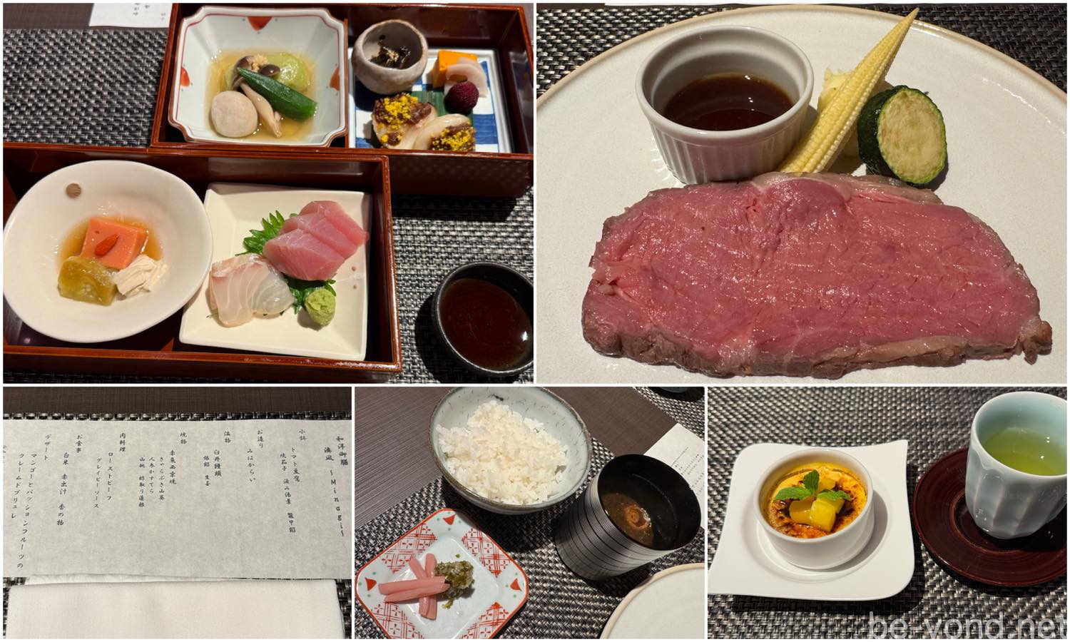 まずはお造り、トマト豆腐の小鉢、銀餡の臼井饅頭、赤魚の西京焼きなど、お膳スタイルからのスタート。その後、ローストビーフ、白米・赤出汁・香の物という順に料理が運ばれる上品なコースでした。メインの肉料理が、前日いただいたビュッフェと被ったのは残念でしたが、刺身に煮物や小鉢、魚・肉料理が少しづつ楽しめる内容です。締めのデザート「マンゴーとパッションフルーツのクレームブリュレ」まで美味しくいただきました。