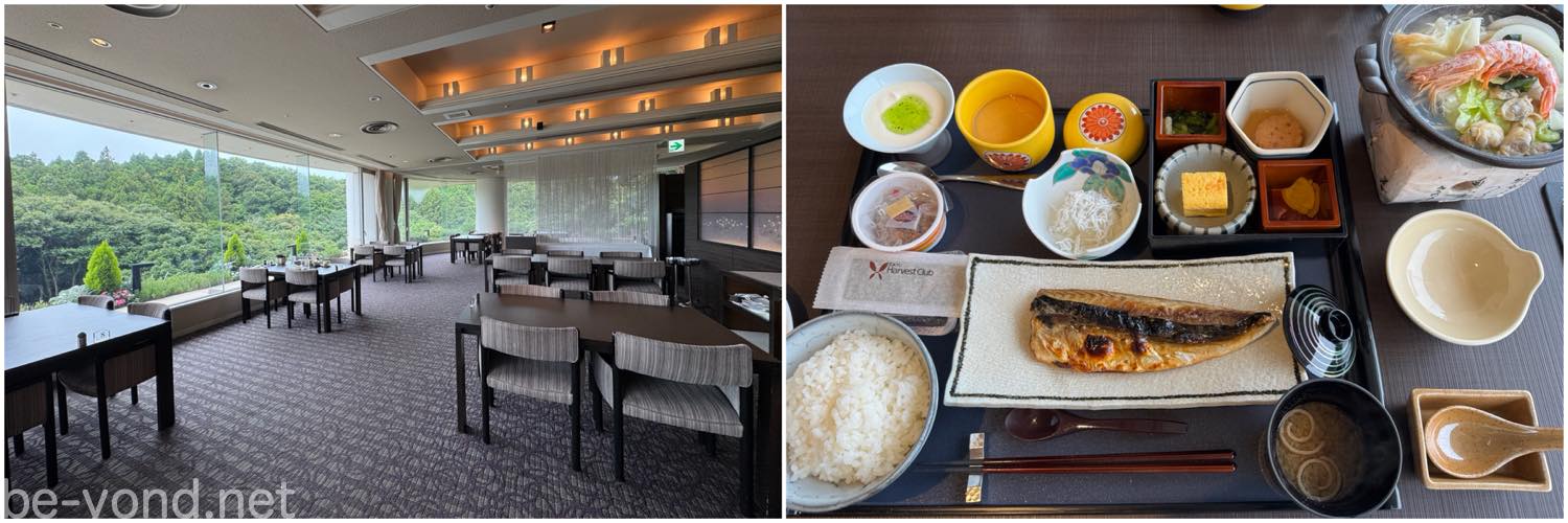 朝食は「和定食」または「洋定食」から選択でき、時間は6:50〜10:00(最終入店9:30)。今回は焼き魚を中心に、出汁巻き卵や小鉢、しらす、香の物、具だくさんの味噌汁に炊き立てご飯、さらに海鮮鍋まで付いた和定食をいただきました。