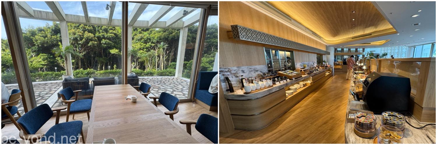 自然光が差し込む明るいダイニングで、鮮やかな緑が広がる庭園を眺めながらいただく朝食は、リゾートならではの贅沢なひとときです。