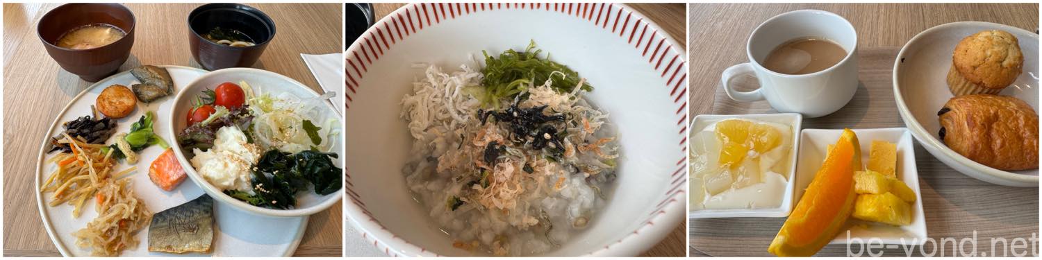 この日は、お腹に優しいおかゆと野菜中心の朝食。食後のデザートにフルーツヨーグルトとマフィンなどいただきました。