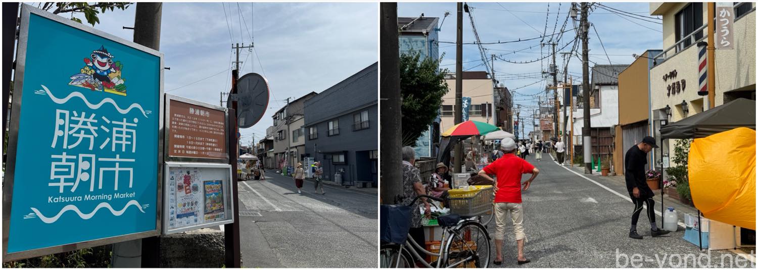 ホテル滞在2日目の朝食後に、車で約15分の「勝浦朝市」を訪問。400年以上の歴史がある朝市で、地元の人々の暮らしが感じられる素朴で温かな雰囲気です。駐車は「墨名(とな)市営駐車場」(148台、入庫後最初の1時間まで無料)を利用しました。
