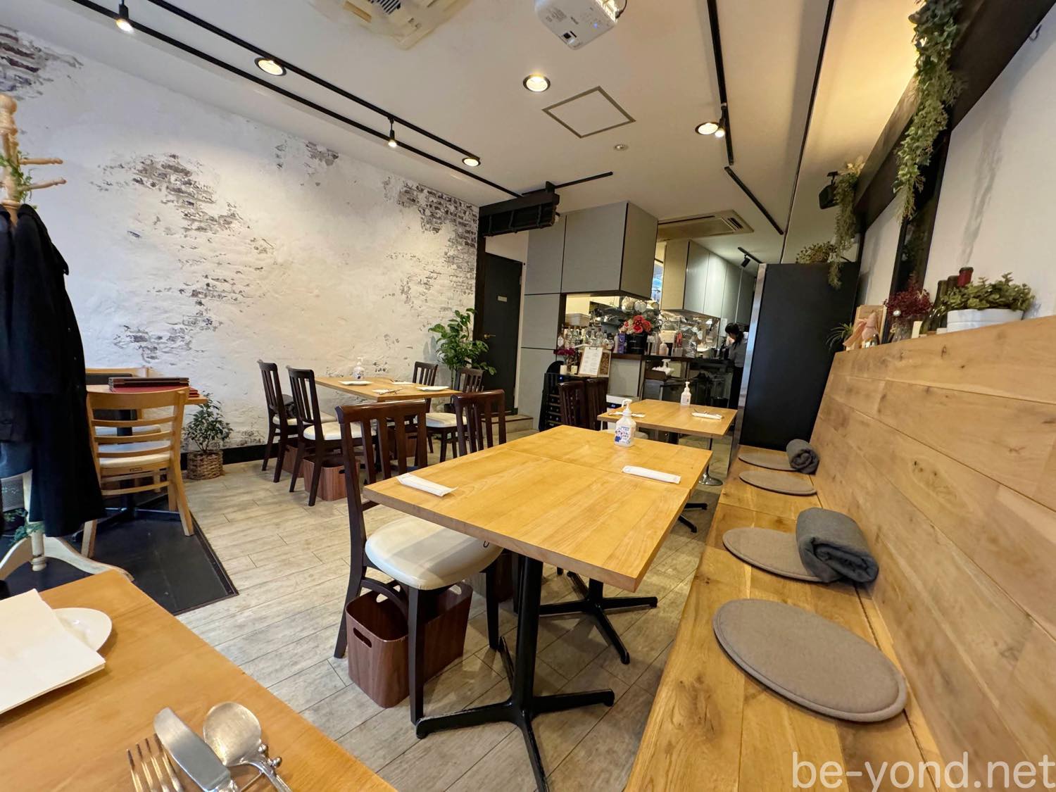「ラ クリヤ」の店内は明るく清潔感のある空間。18席(4名テーブル✕4・2名テーブル)のほか、奥に2〜4名用の半個室(有料)があるようです。