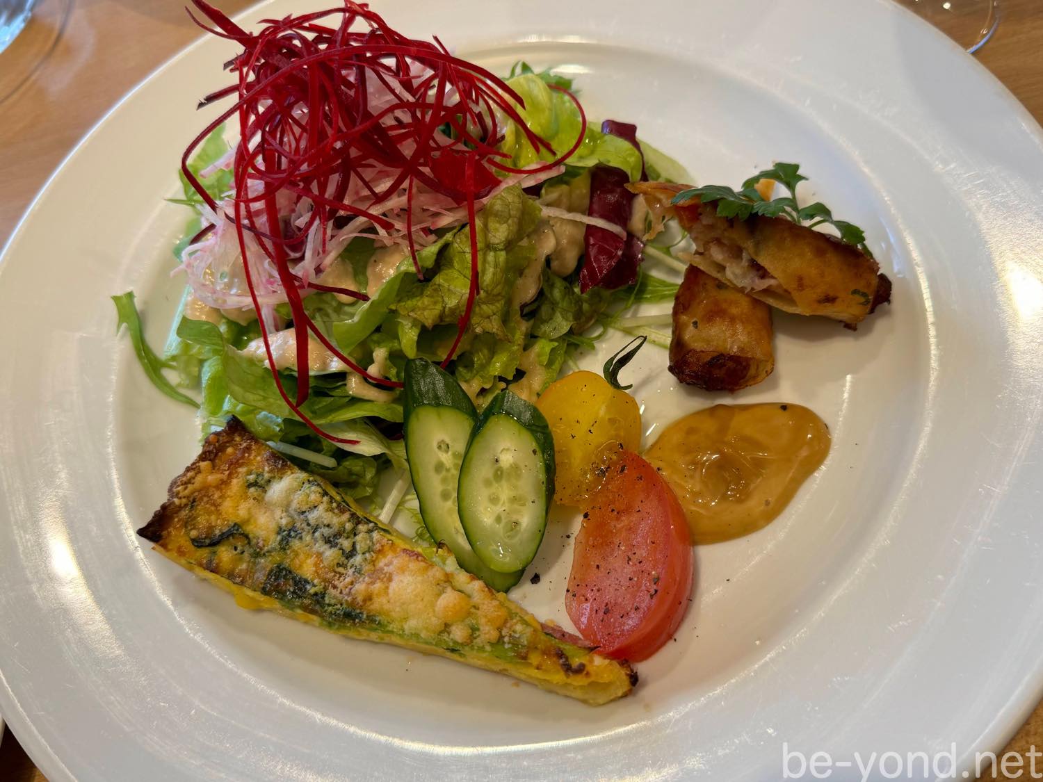 本日の前菜盛合せは、自家製のフレンチドレッシングがかかったミックスサラダに、シーフード春巻きとキッシュの2種の前菜。添えられたロブスターソースが絶妙です!