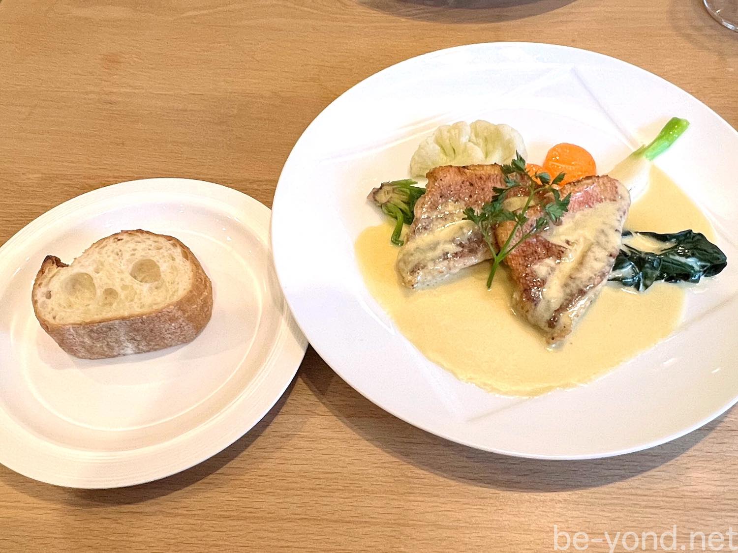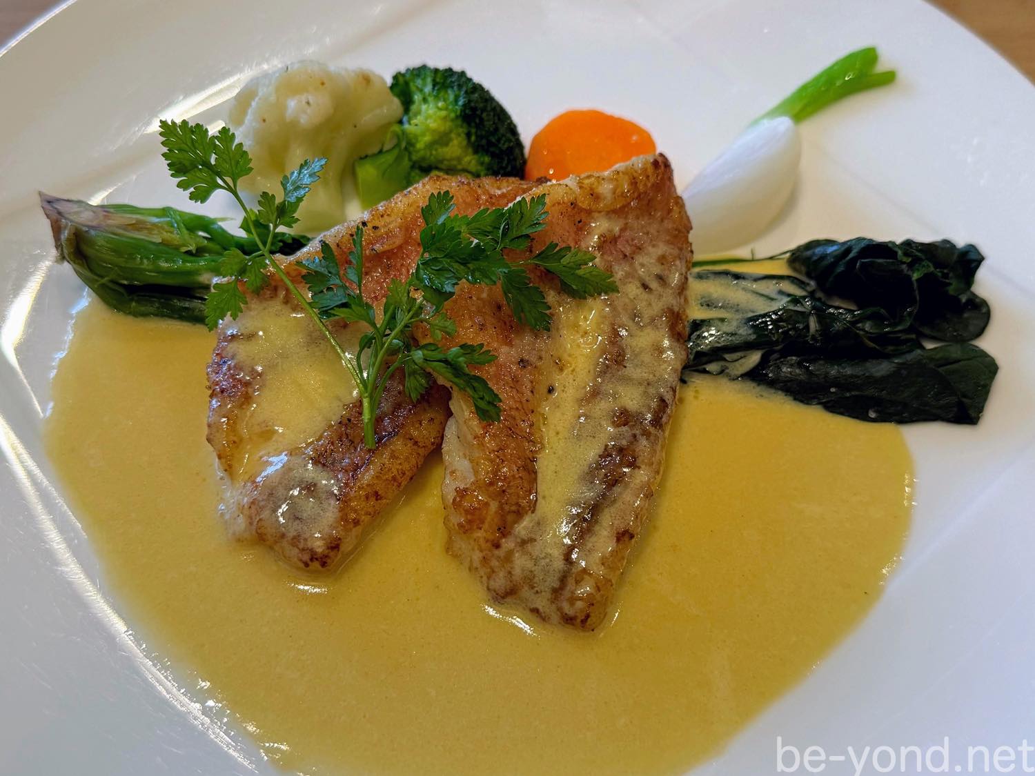 色とりどりの野菜が添えられたお魚料理「カサゴのポワレ」は、パリッとした皮の香ばしい風味と濃厚なクリーミーソースの相性が抜群!お料理はすべて化学調味料不使用というのも嬉しいポイントです。
